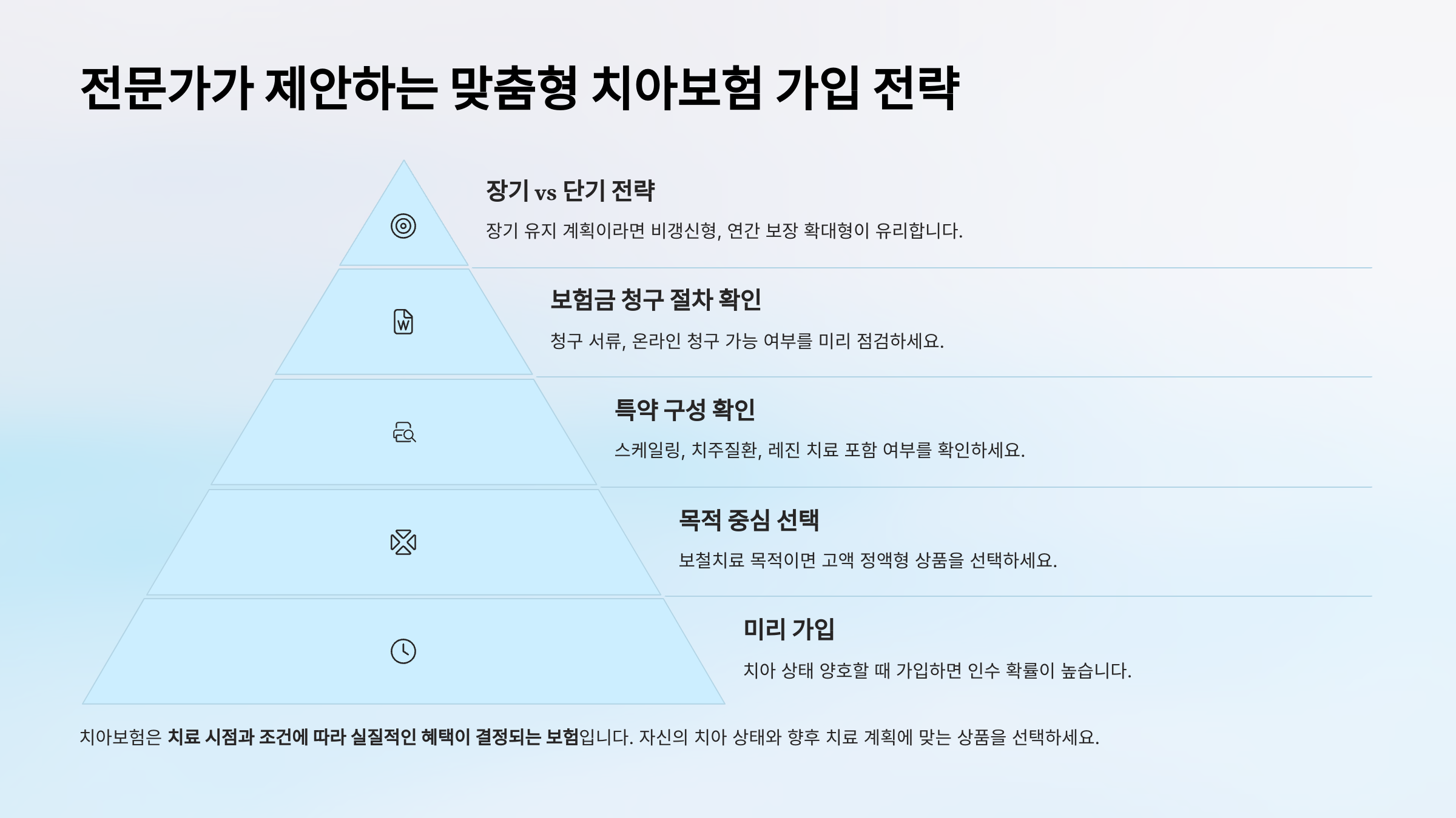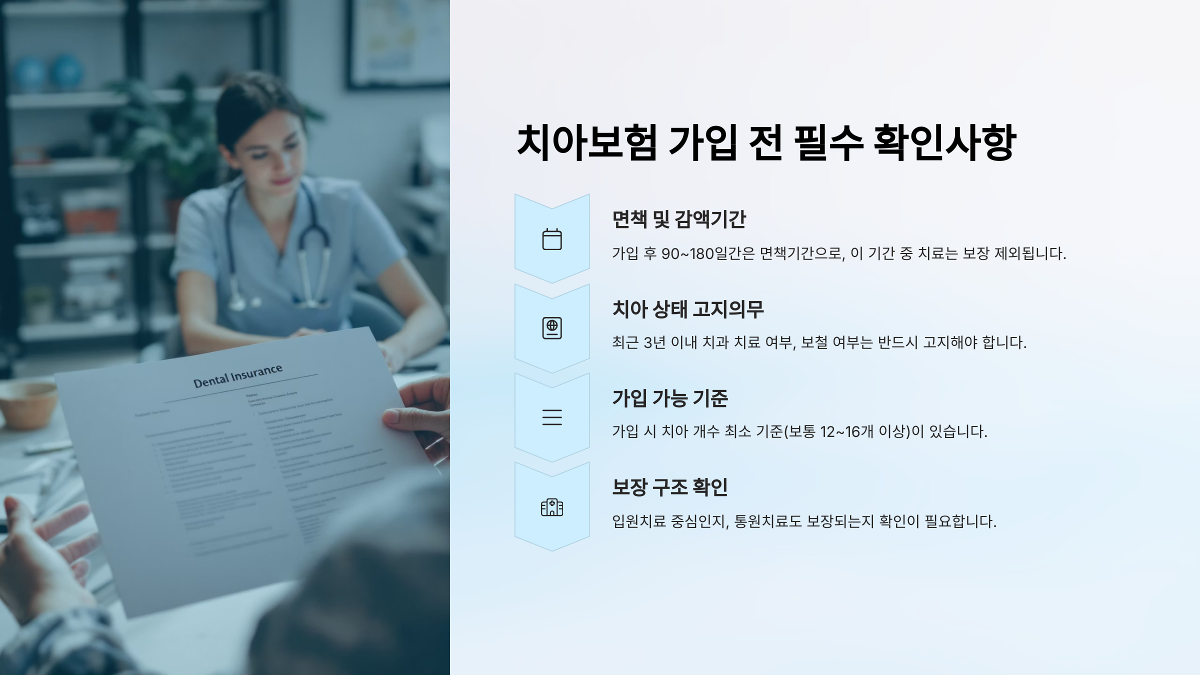 가입 전 반드시 자신의 치아 상태를 확인하고, 향후 치료 계획에 따라 맞춤형 상품을 선택해야 합니다. 보험 전문가와의 상담을 통해 비교 분석한 후 가입하는 것이 가장 바람직합니다.