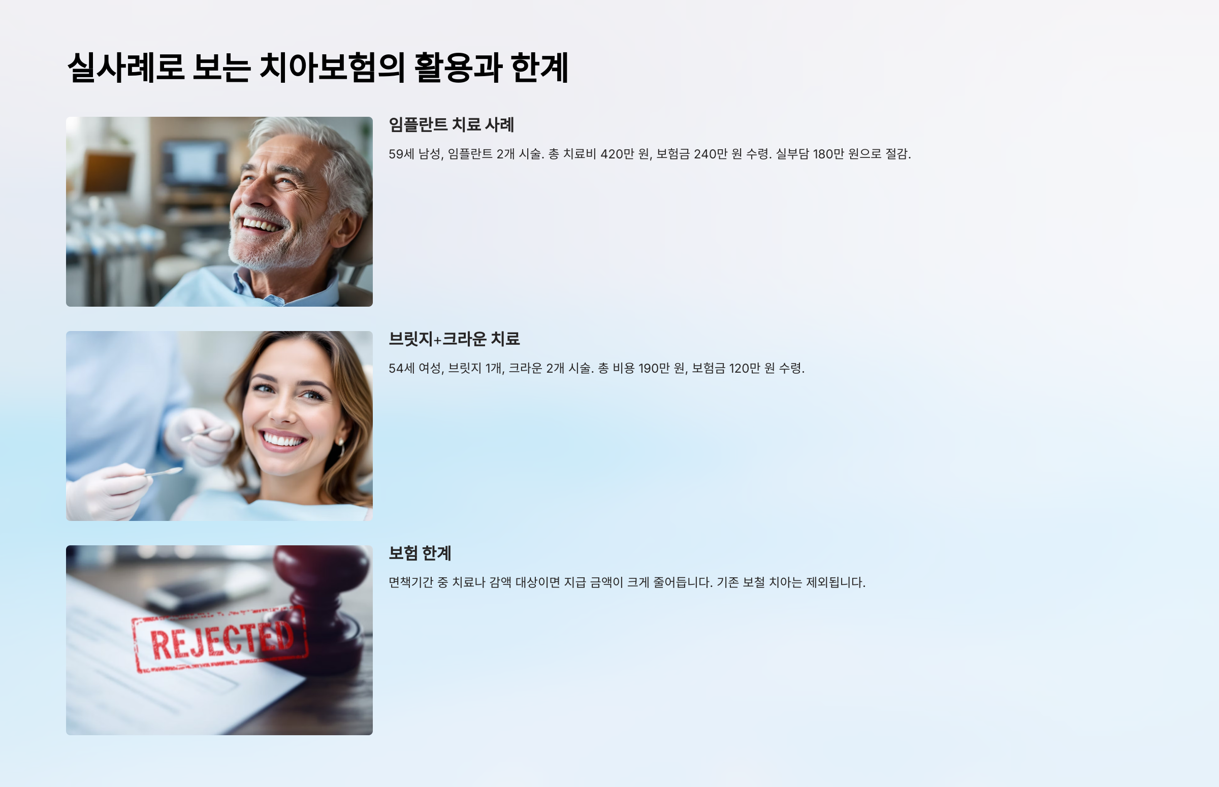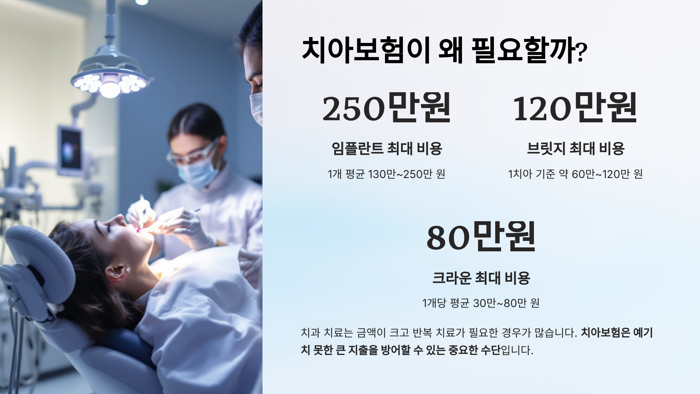 이처럼 치과 치료는 금액이 크고 반복 치료가 필요한 경우가 많기 때문에, 치아보험은 예기치 못한 큰 지출을 방어할 수 있는 중요한 수단입니다.