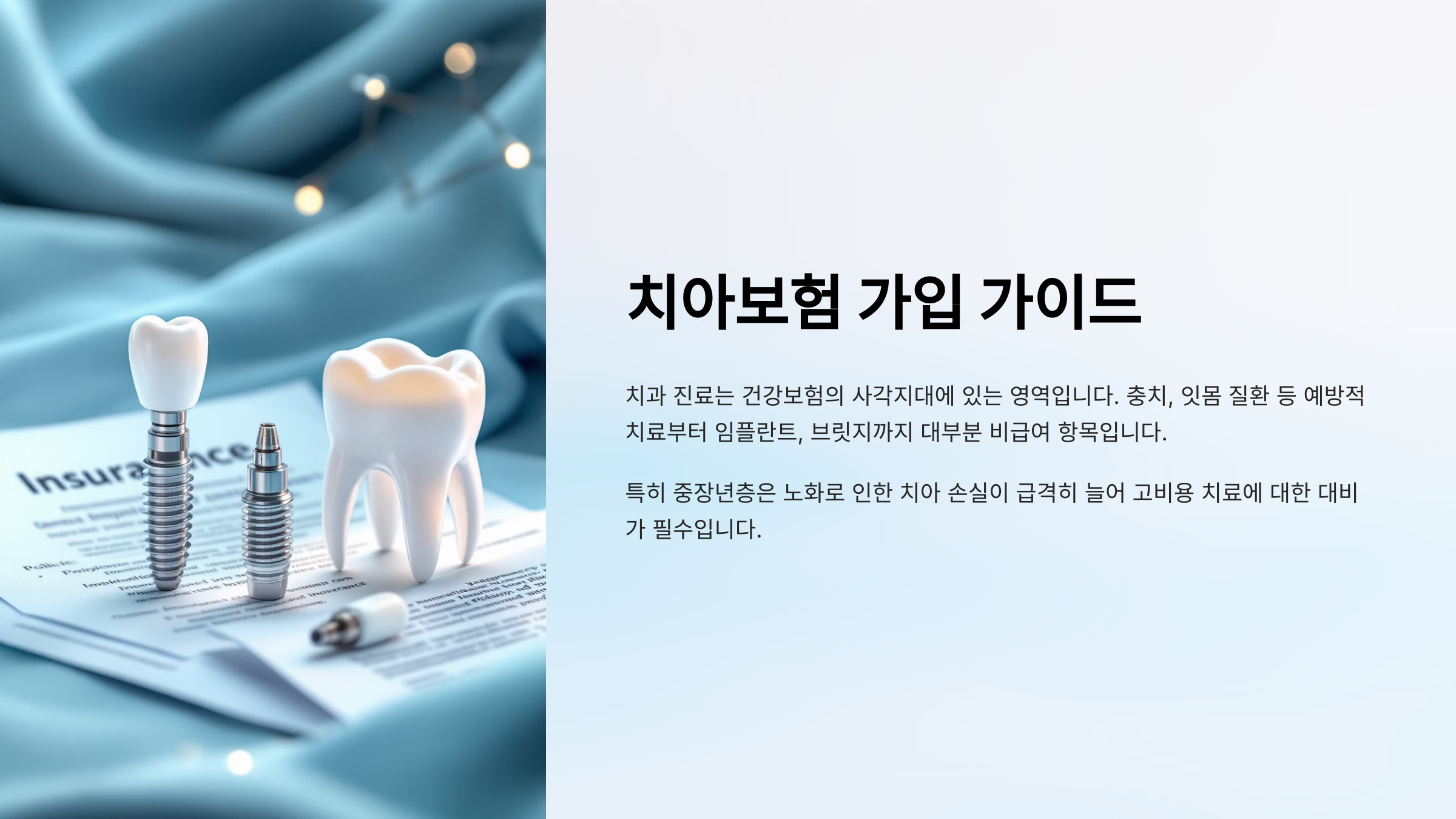 치과 진료는 건강보험의 사각지대에 있는 대표적인 영역입니다. 충치, 잇몸 질환 등 예방적 치료는 물론, 임플란트, 브릿지, 크라운 등 보철 치료는 건강보험 비급여 항목이 대부분이어서 환자가 전액을 부담합니다. 특히 중장년층은 노화로 인한 치아 손실이 급격히 늘어 고비용 치료에 대한 대비가 필수입니다.