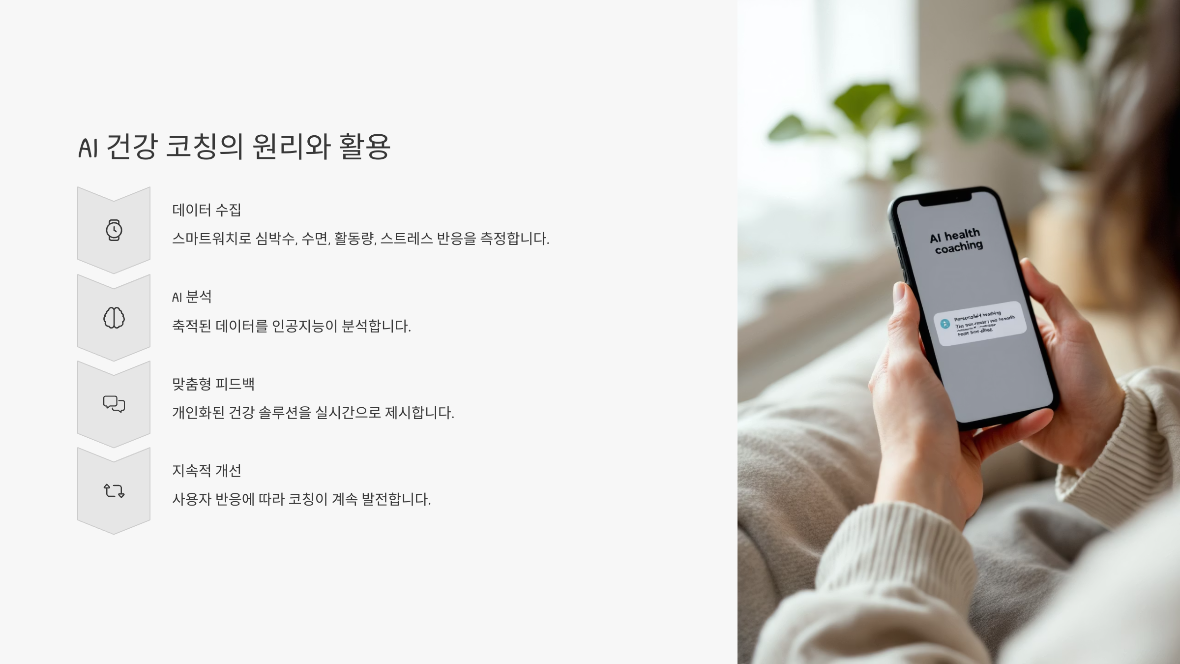 이처럼 AI 건강 코칭은 개인의 생체 데이터를 분석해 실시간 피드백을 제공합니다. 그 원리는 간단합니다. 스마트워치나 밴드를 통해 심박수, 수면 패턴, 활동량, 스트레스 반응 등을 측정하고, 축적된 데이터를 AI가 분석해 맞춤형 건강 솔루션을 제시하는 거죠.