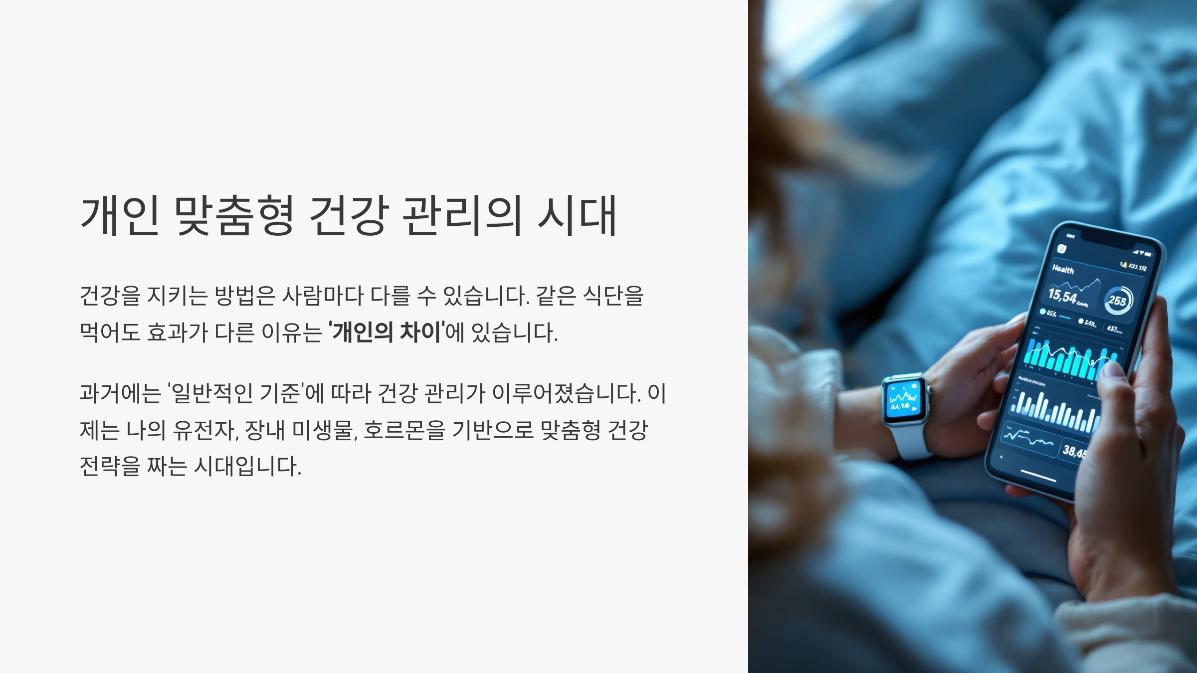 건강을 지키는 방법은 사람마다 다를 수 있습니다. 같은 식단을 먹어도 누군가는 체중이 줄고, 누군가는 별 효과를 보지 못하는 이유는 무엇일까요? 그 답은 바로 ‘개인의 차이’에 있습니다. 최근 들어 ‘개인 맞춤형 건강 관리’가 주목받는 이유도 바로 여기에 있습니다.