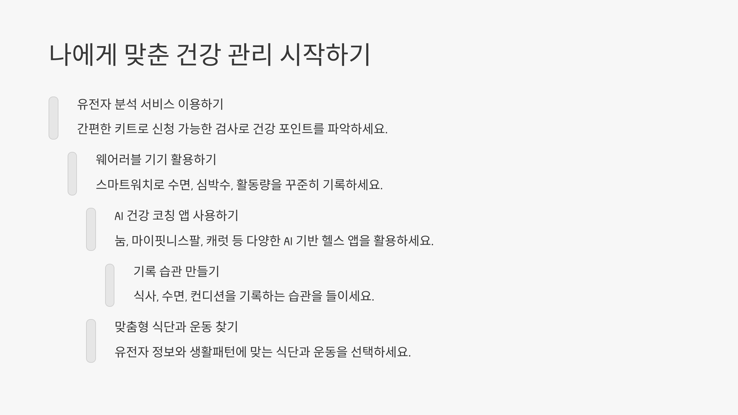 복잡하게 느껴질 수도 있지만, 개인 맞춤형 건강 관리는 다음과 같은 간단한 단계로 시작할 수 있어요: