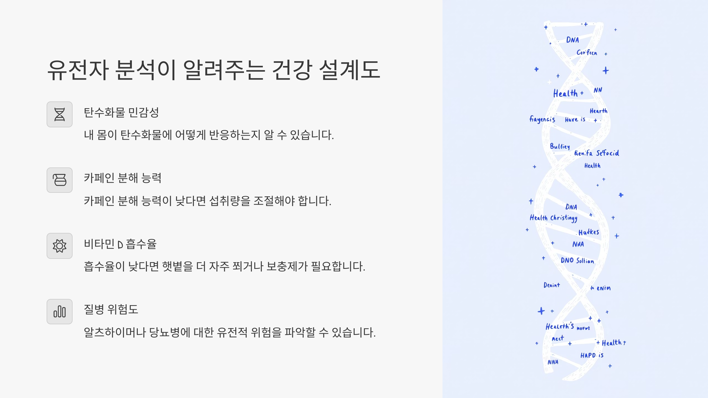 이 정보를 바탕으로 내 몸의 특성을 깊이 이해할 수 있죠. 예를 들어: