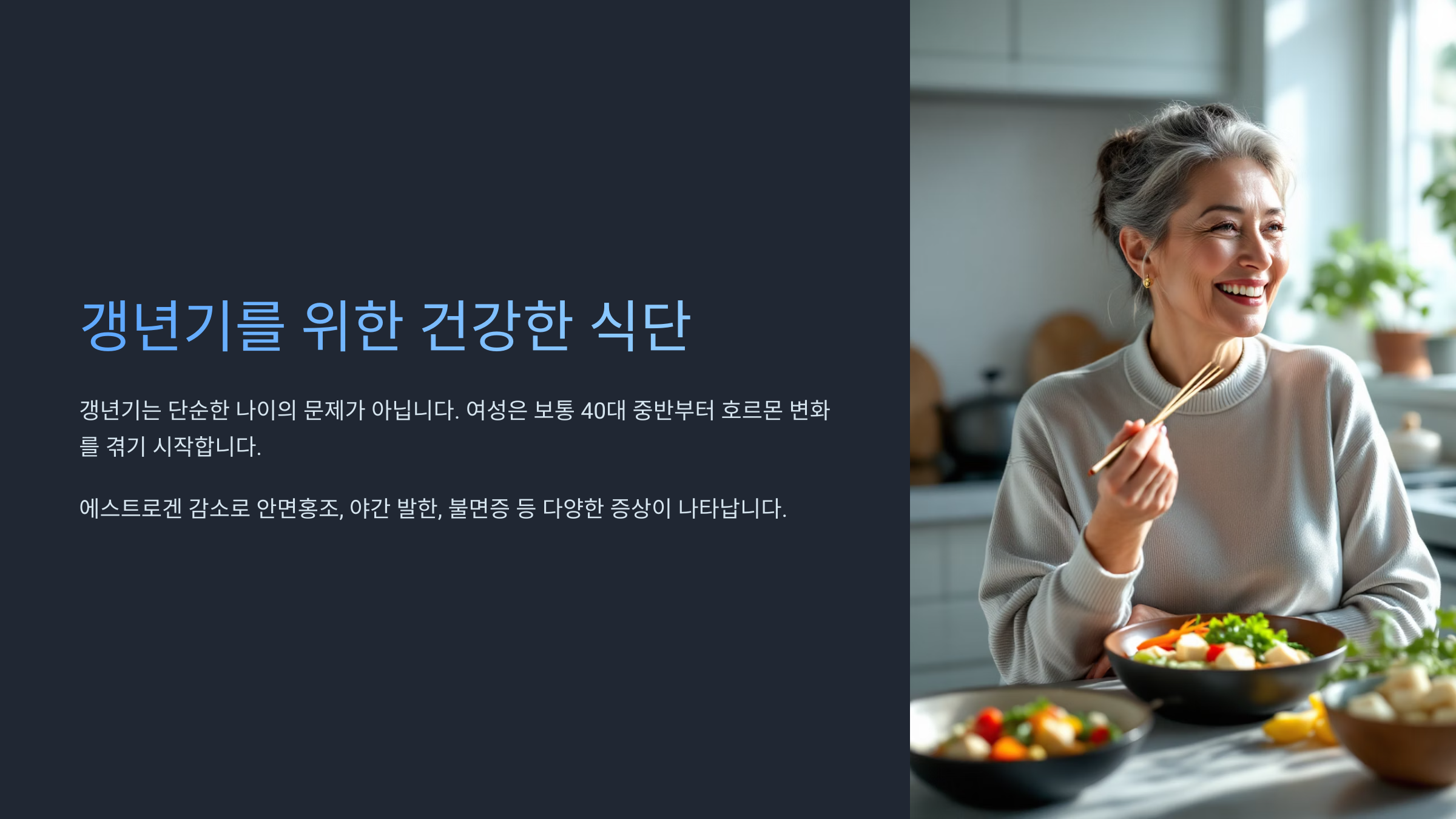 갱년기를 건강하게 보내기 위해서는 단순히 칼로리를 줄이는 다이어트보다는, 우리 몸이 진짜 필요로 하는 영양소를 충분히 공급하는 것이 중요합니다.