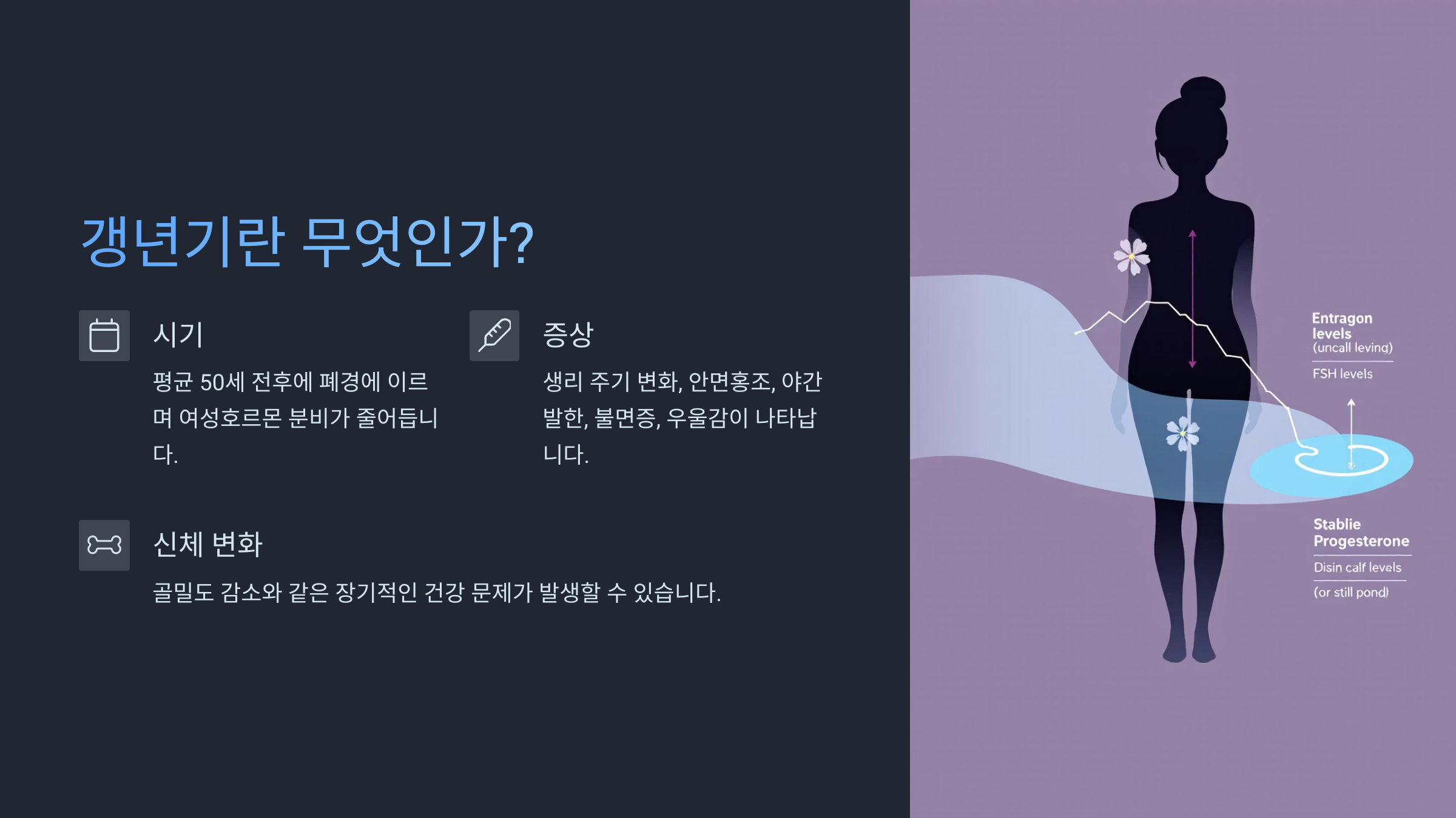 갱년기는 단순한 나이의 문제가 아닙니다. 여성은 보통 40대 중반부터 호르몬의 변화를 겪기 시작해 평균 50세 전후에 폐경에 이릅니다. 이 시기에는 에스트로겐이라는 여성호르몬의 분비가 줄어들면서 생리 주기의 변화, 안면홍조, 야간 발한, 불면증, 우울감, 골밀도 감소 등 다양한 증상을 경험하게 됩니다.