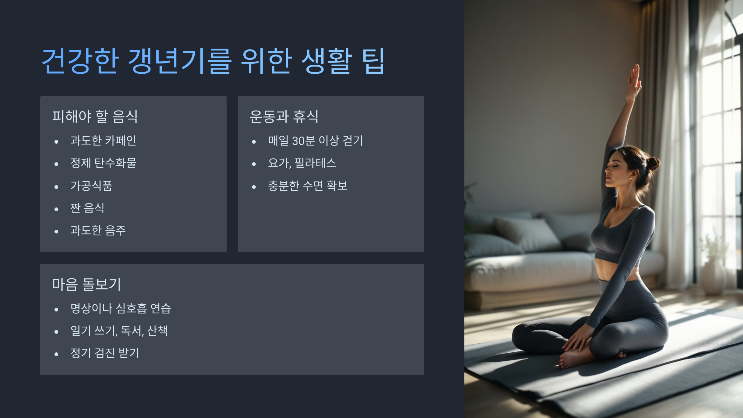 음식 외에도 생활 습관의 변화는 갱년기 증상 완화에 큰 도움이 됩니다.
