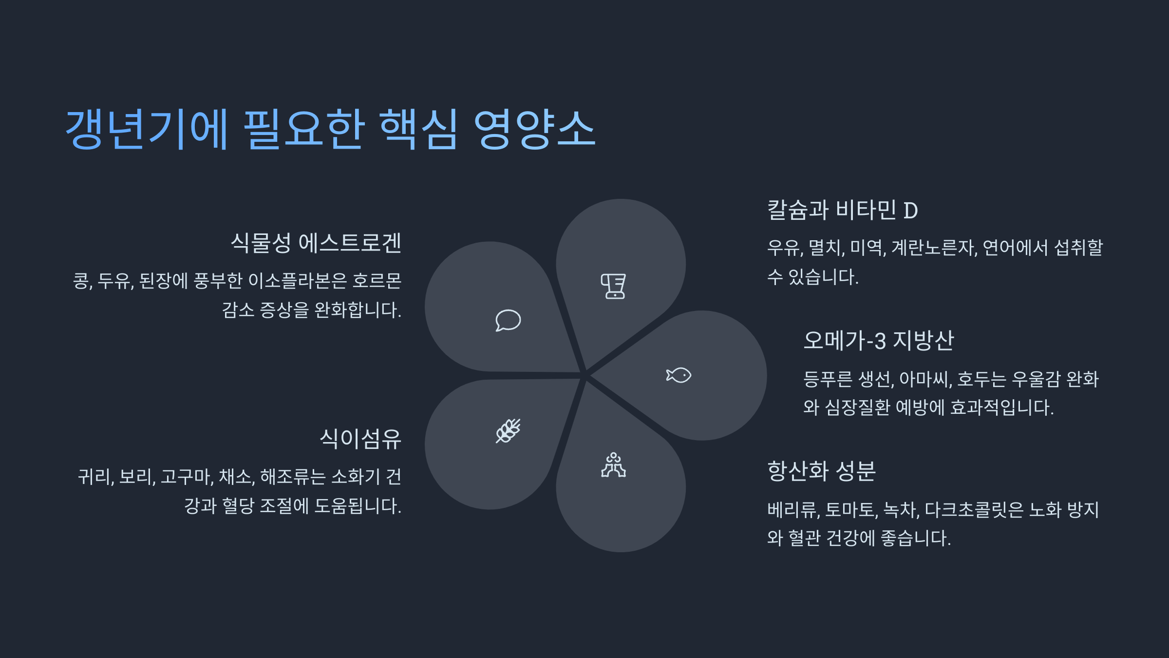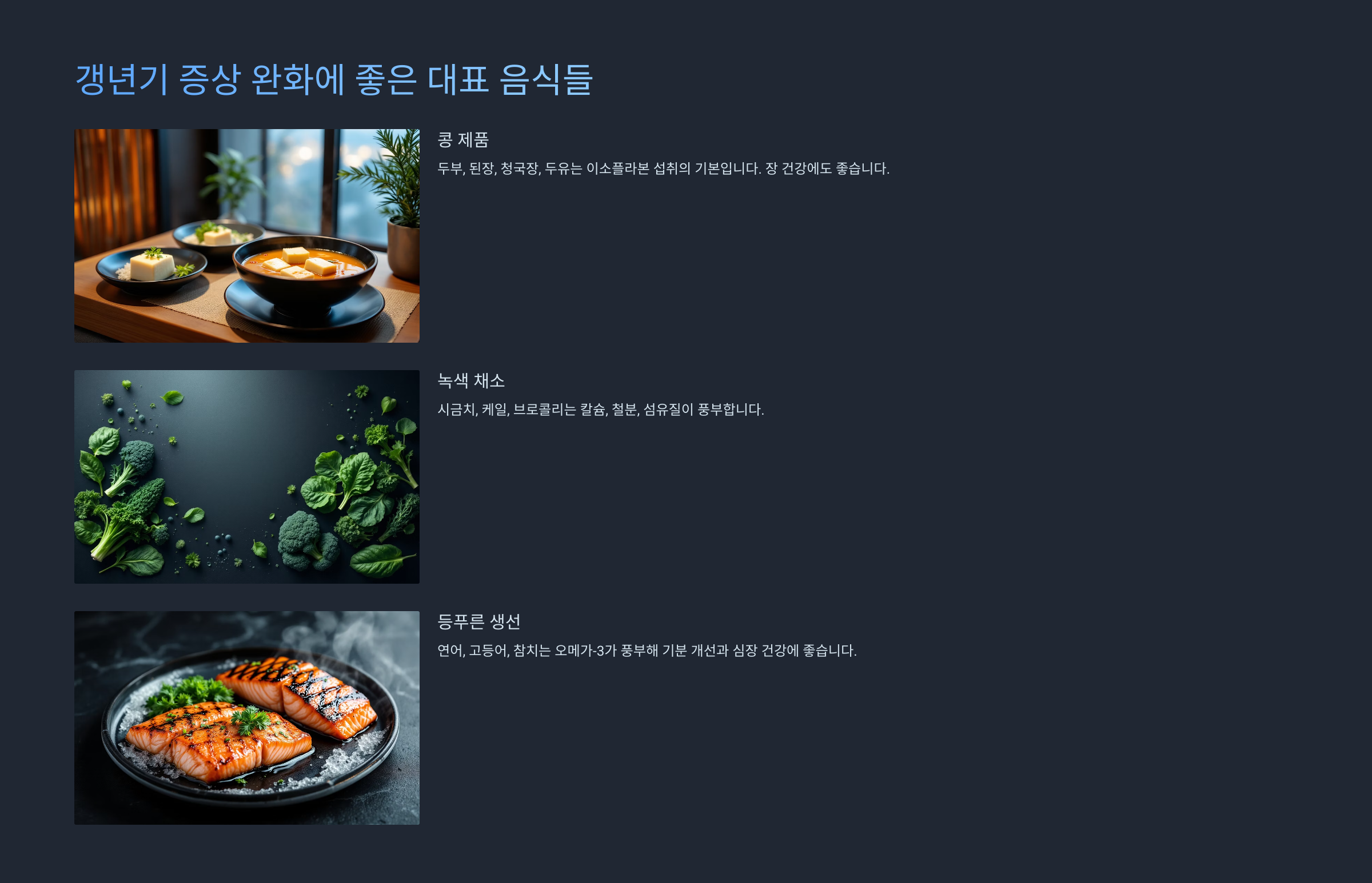 갱년기 음식은 생각보다 어렵지 않게 일상 식단에 녹여낼 수 있습니다.