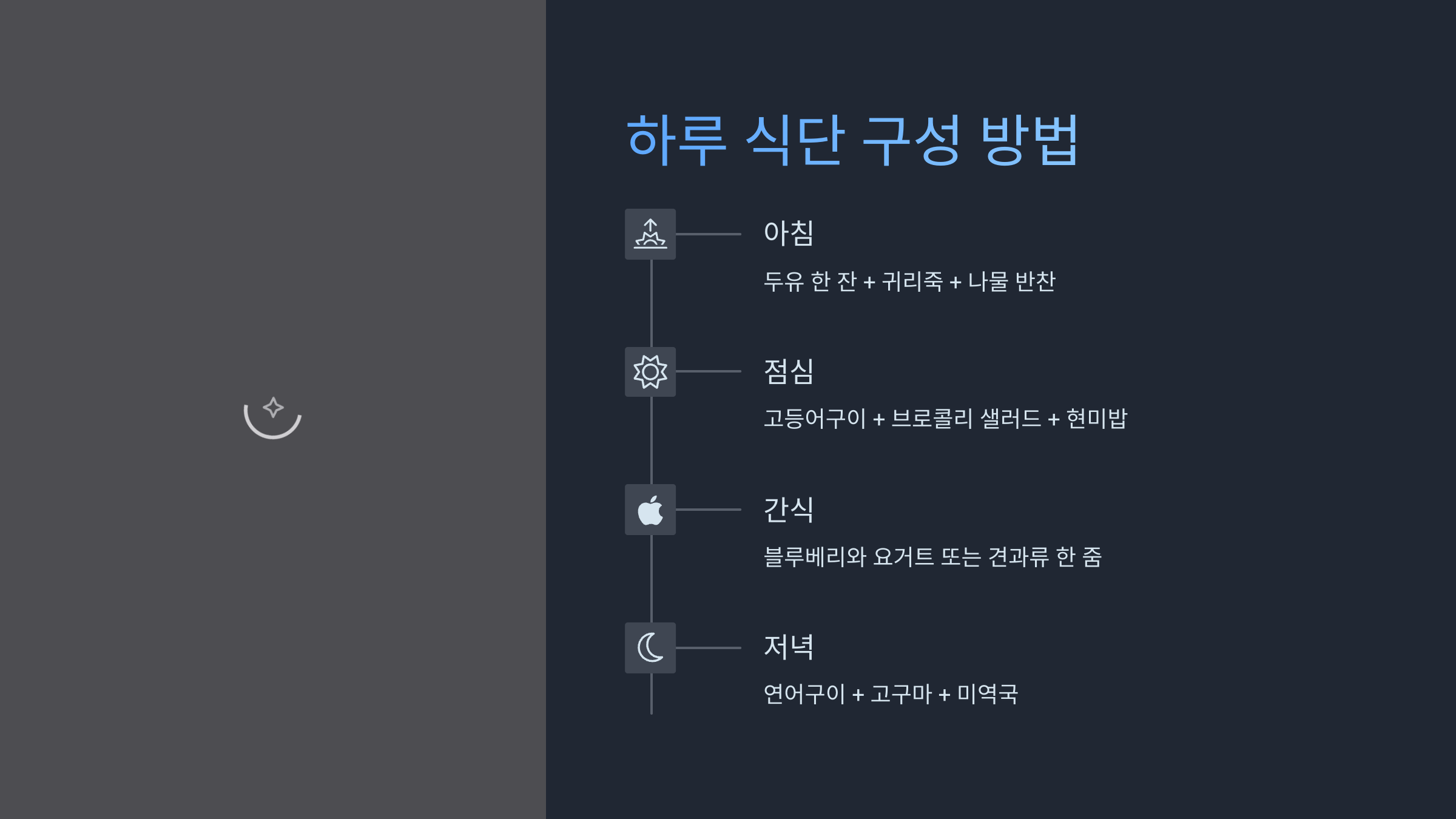 - 점심: 고등어구이 + 브로콜리 샐러드 + 현미밥