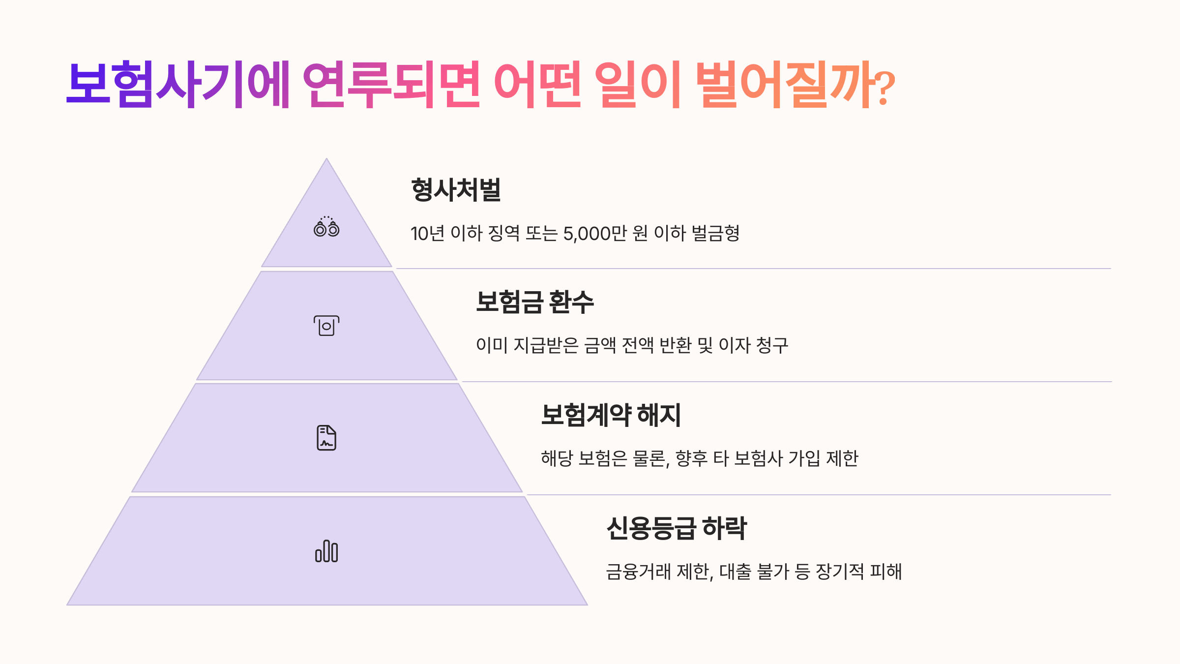 보험사기는 단순한 실수가 아닌 범죄입니다. 고의든 아니든 연루될 경우 치명적인 불이익과 형사처벌을 받을 수 있습니다.