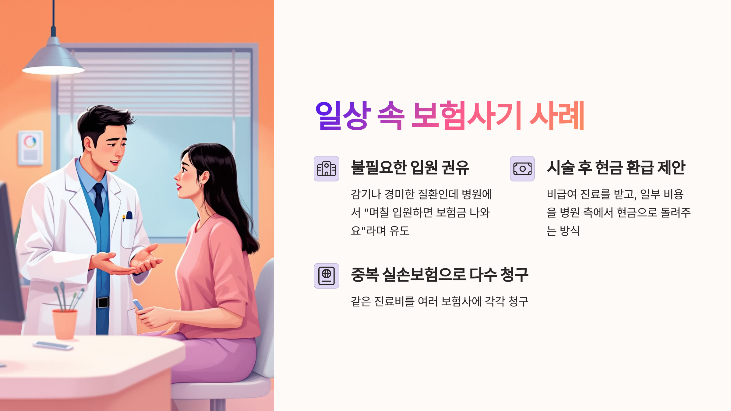 - 불필요한 입원 권유: 감기나 경미한 질환인데 병원에서 "며칠 입원하면 보험금 나와요"라며 유도