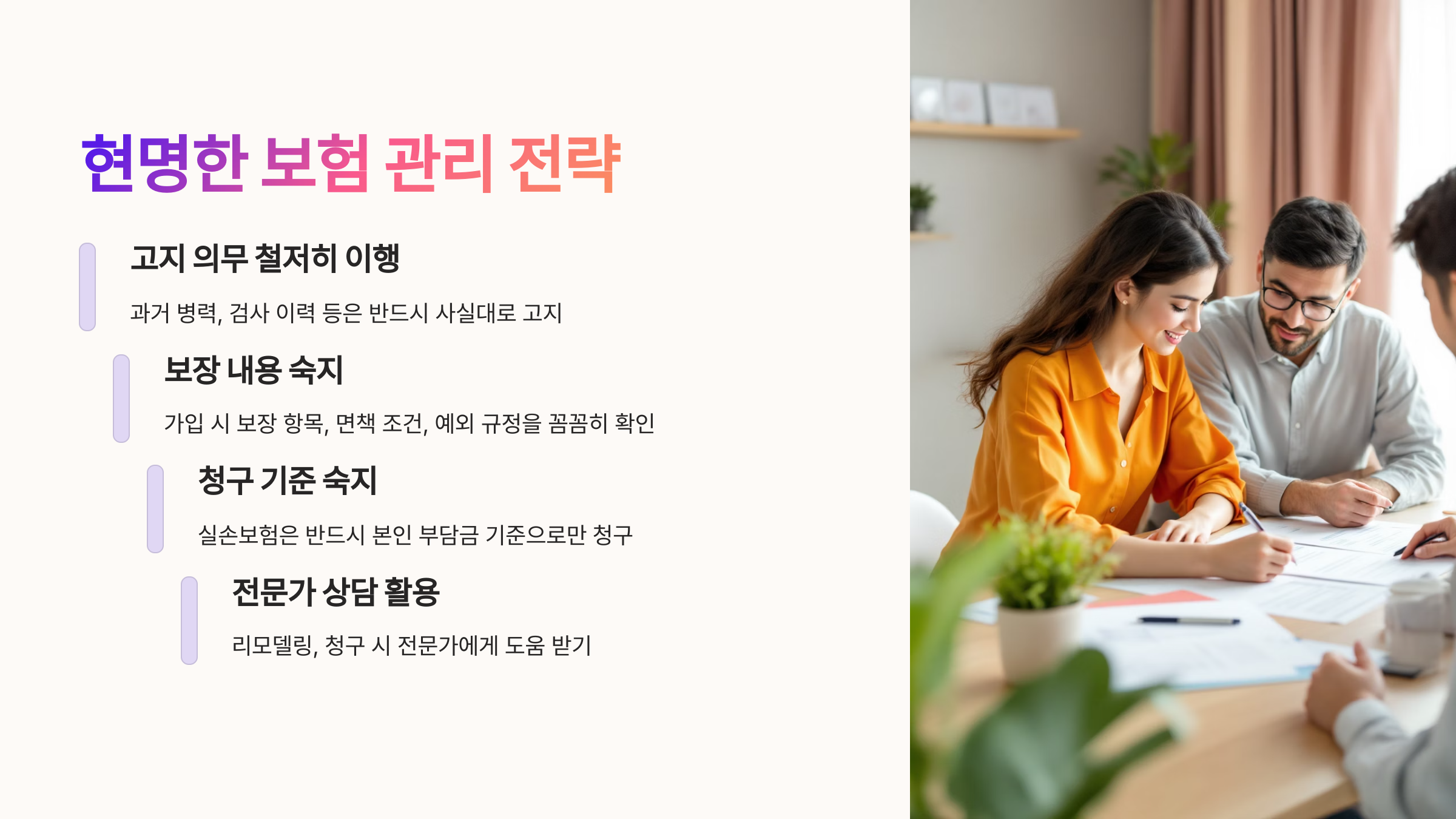- 보장 내용 숙지: 가입 시 보장 항목, 면책 조건, 예외 규정을 꼼꼼히 확인