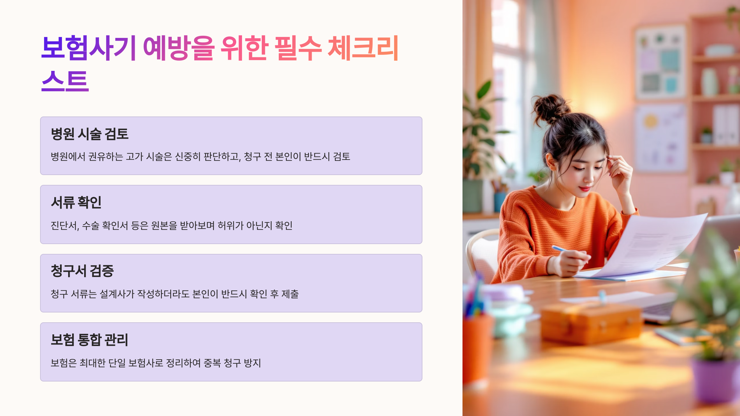 지금 당신의 보험 청구 방식은 안전한가요? 병원이나 설계사의 말을 무비판적으로 따르고 있진 않나요? 보험은 나와 가족의 미래를 지키는 중요한 도구입니다. 정직하고 정확한 보험생활로, 위험 없는 건강한 재정 관리를 시작해보세요.