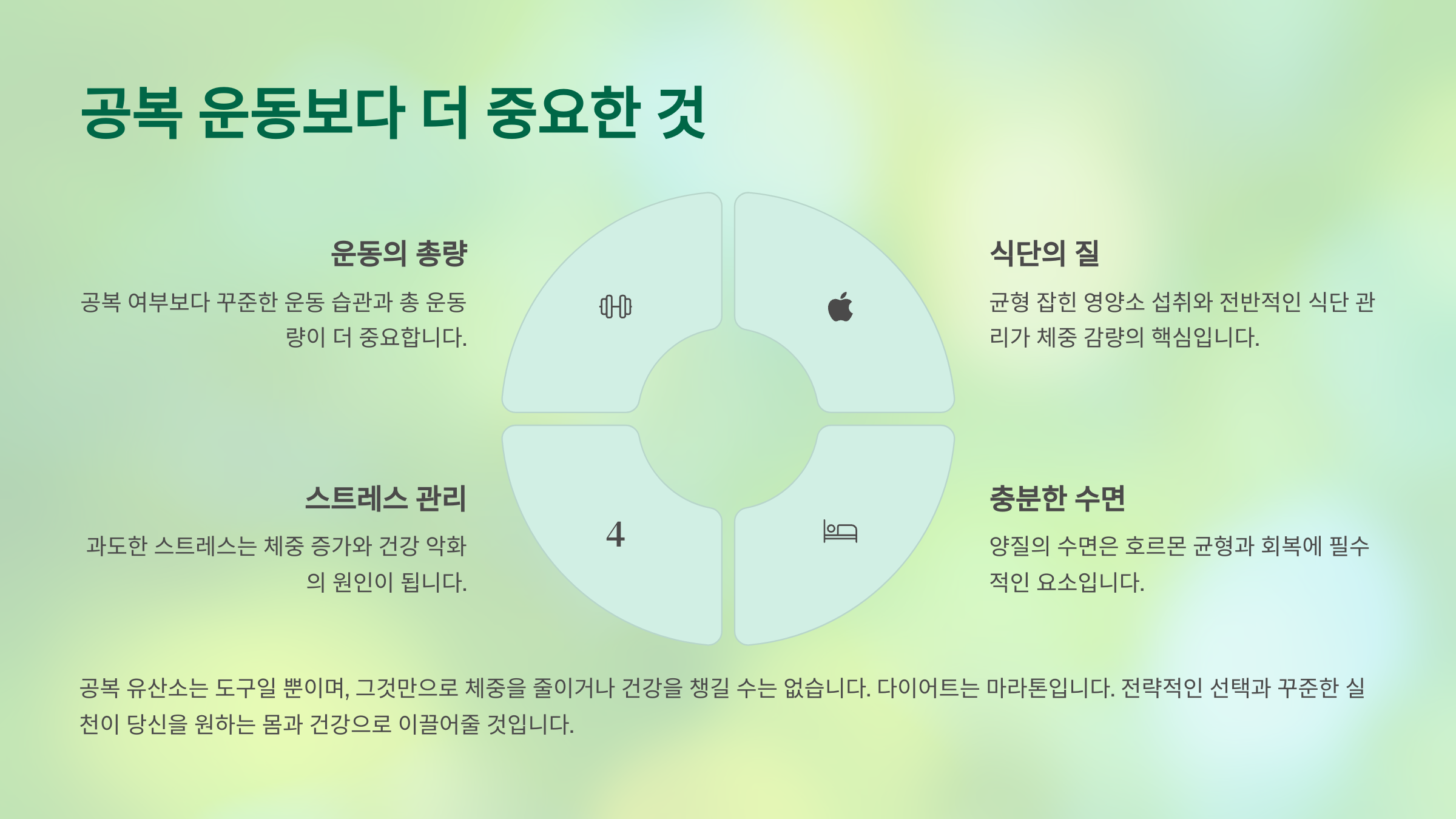 다이어트를 지속 가능하게 만들고, 건강하게 체지방을 감량하기 위해 가장 중요한 것은 공복 여부가 아닙니다. 운동의 총량, 식단의 질, 수면, 스트레스 관리, 그리고 무엇보다 꾸준함이 핵심입니다.