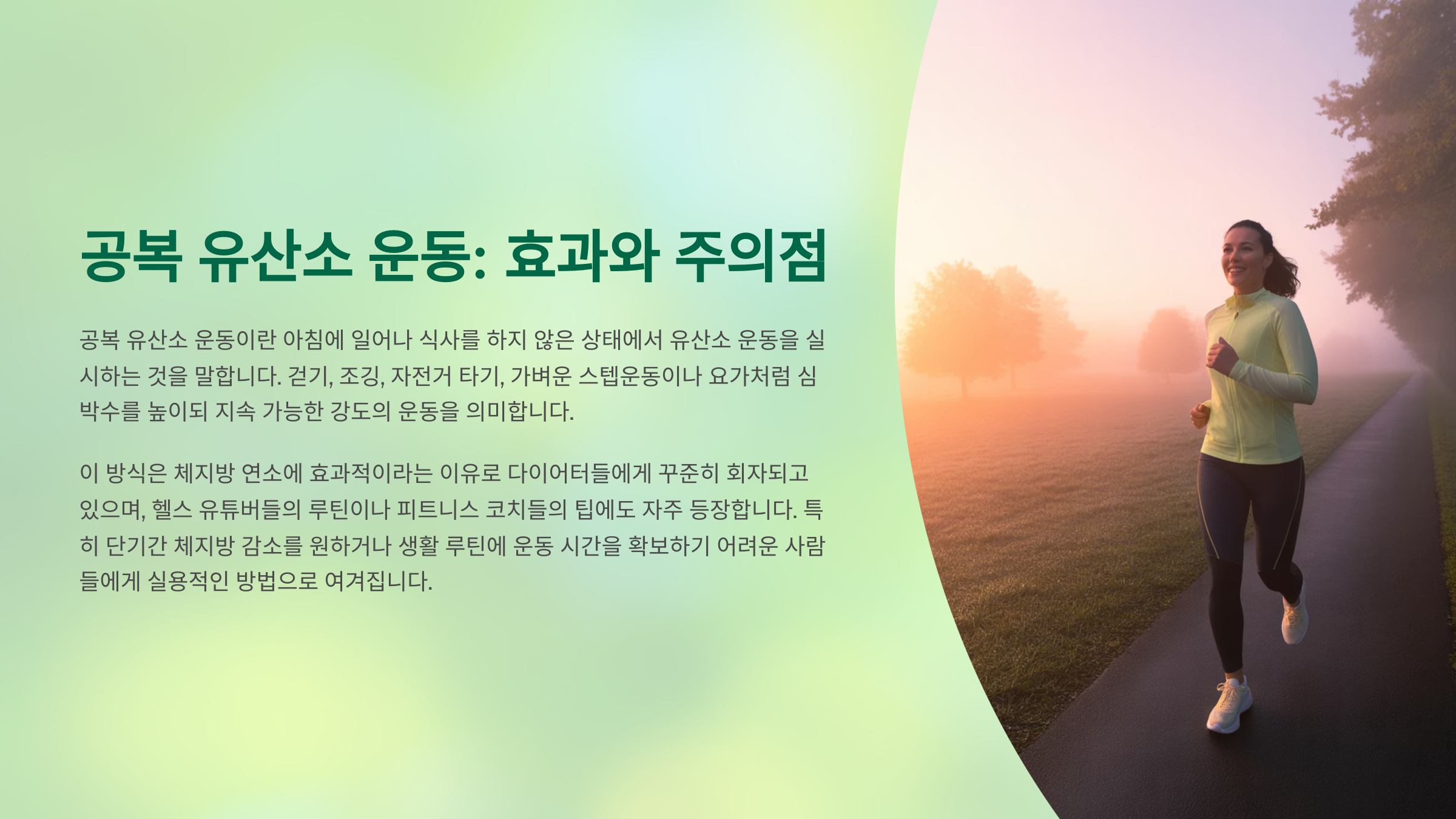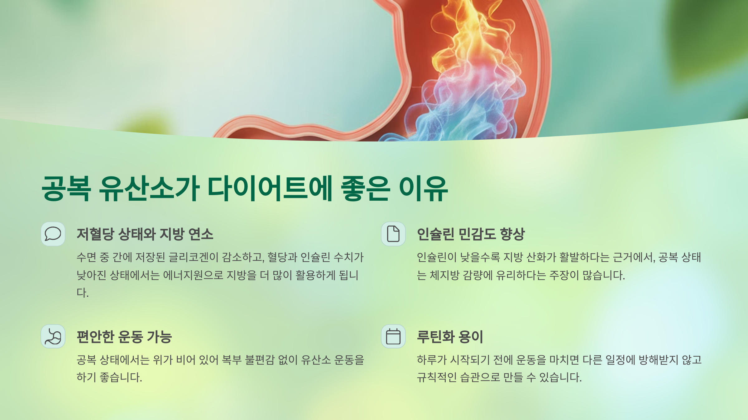 - 식사 후보다 가볍게 운동할 수 있음: 공복 상태에서는 위가 비어 있어 복부 불편감 없이 유산소 운동을 하기 좋습니다.