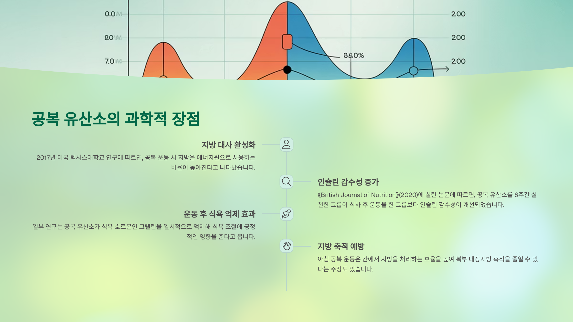 - 인슐린 감수성 증가: 《British Journal of Nutrition》(2020)에 실린 논문에 따르면, 공복 유산소를 6주간 실천한 그룹이 식사 후 운동을 한 그룹보다 인슐린 감수성이 개선되었습니다. 이는 혈당 관리와 지방 축적 억제에 도움이 됩니다.