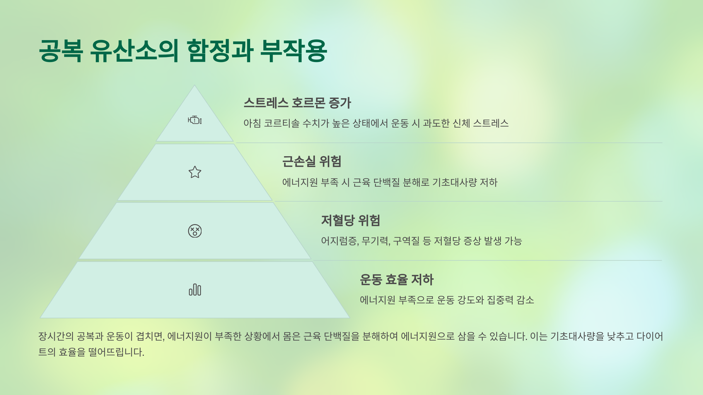 공복 유산소는 도구일 뿐이며, 그것만으로 체중을 줄이거나 건강을 챙길 수는 없습니다. 오히려 무리한 실천은 탈진, 근손실, 호르몬 불균형 등 부작용을 불러올 수 있습니다. 나에게 맞는 방식으로 조절하고, 체계적으로 실천하는 것이 최고의 전략입니다.