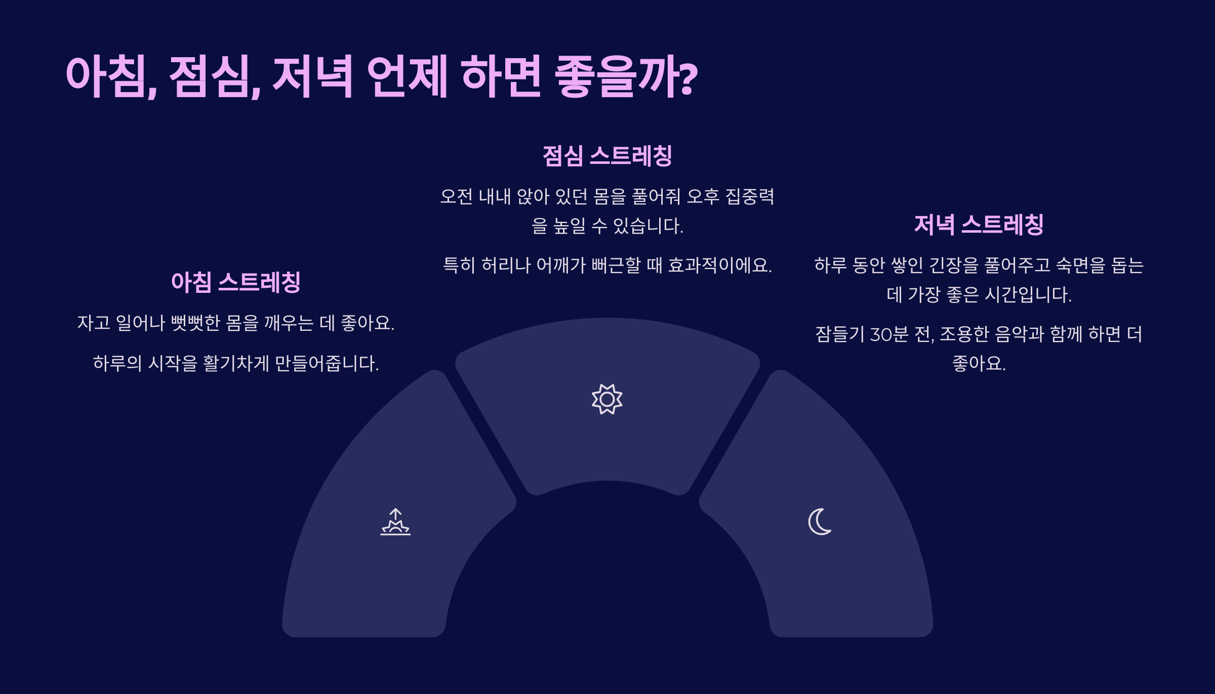 - 점심 스트레칭: 오전 내내 앉아 있던 몸을 풀어줘 오후 집중력을 높일 수 있습니다. 특히 허리나 어깨가 뻐근할 때 효과적이에요.