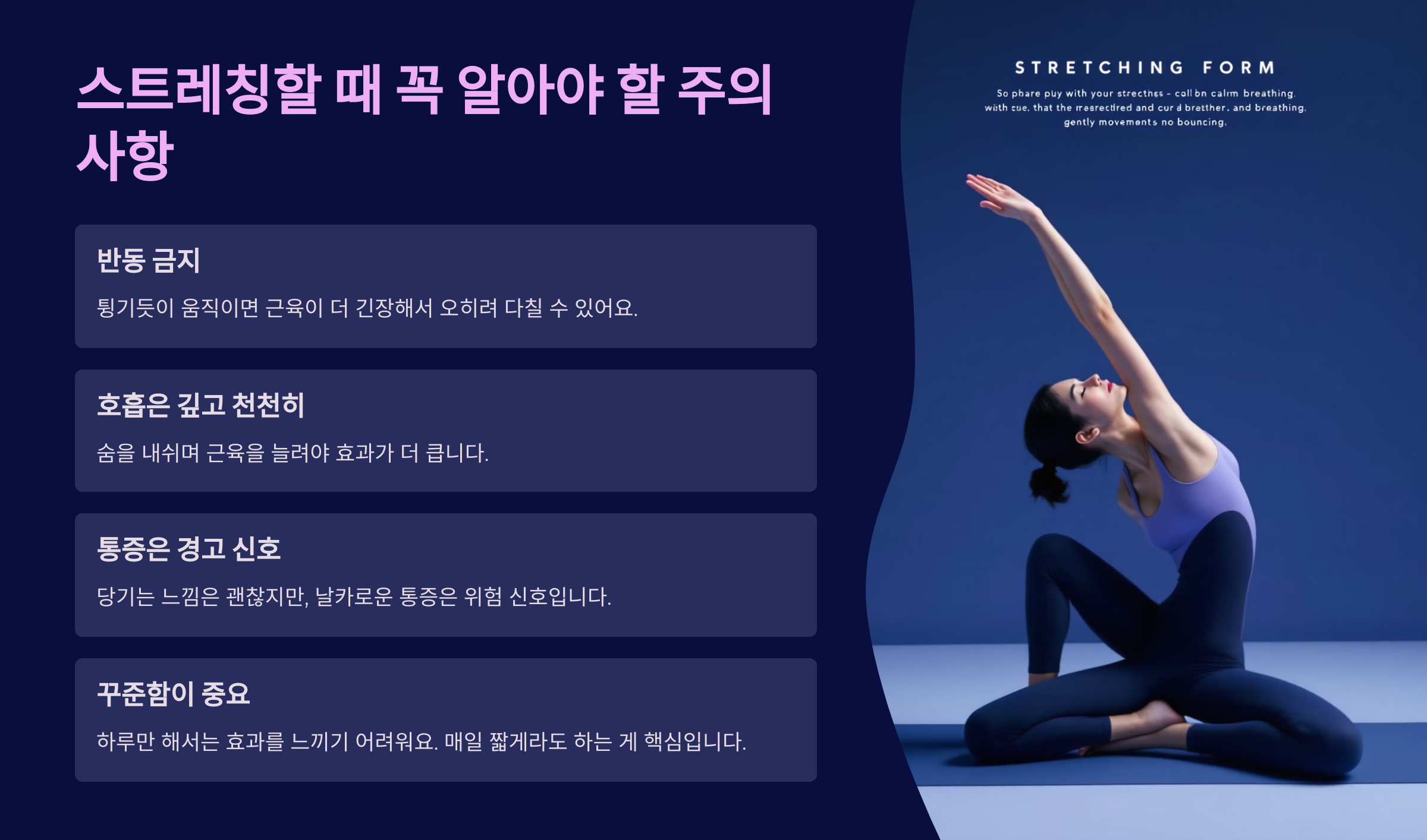 - 반동 금지: 튕기듯이 움직이면 근육이 더 긴장해서 오히려 다칠 수 있어요.