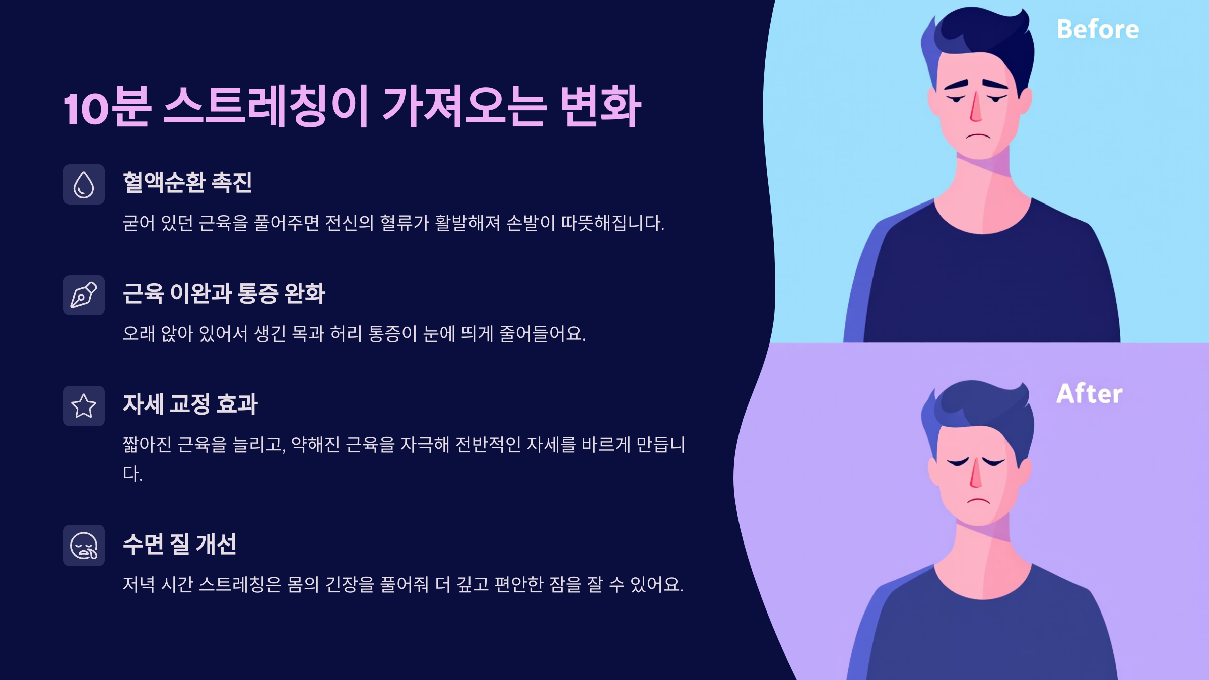 실제로 10분 스트레칭을 2주만 꾸준히 실천해도 어깨 결림이 줄고, 피곤함이 덜하다는 반응이 많습니다.