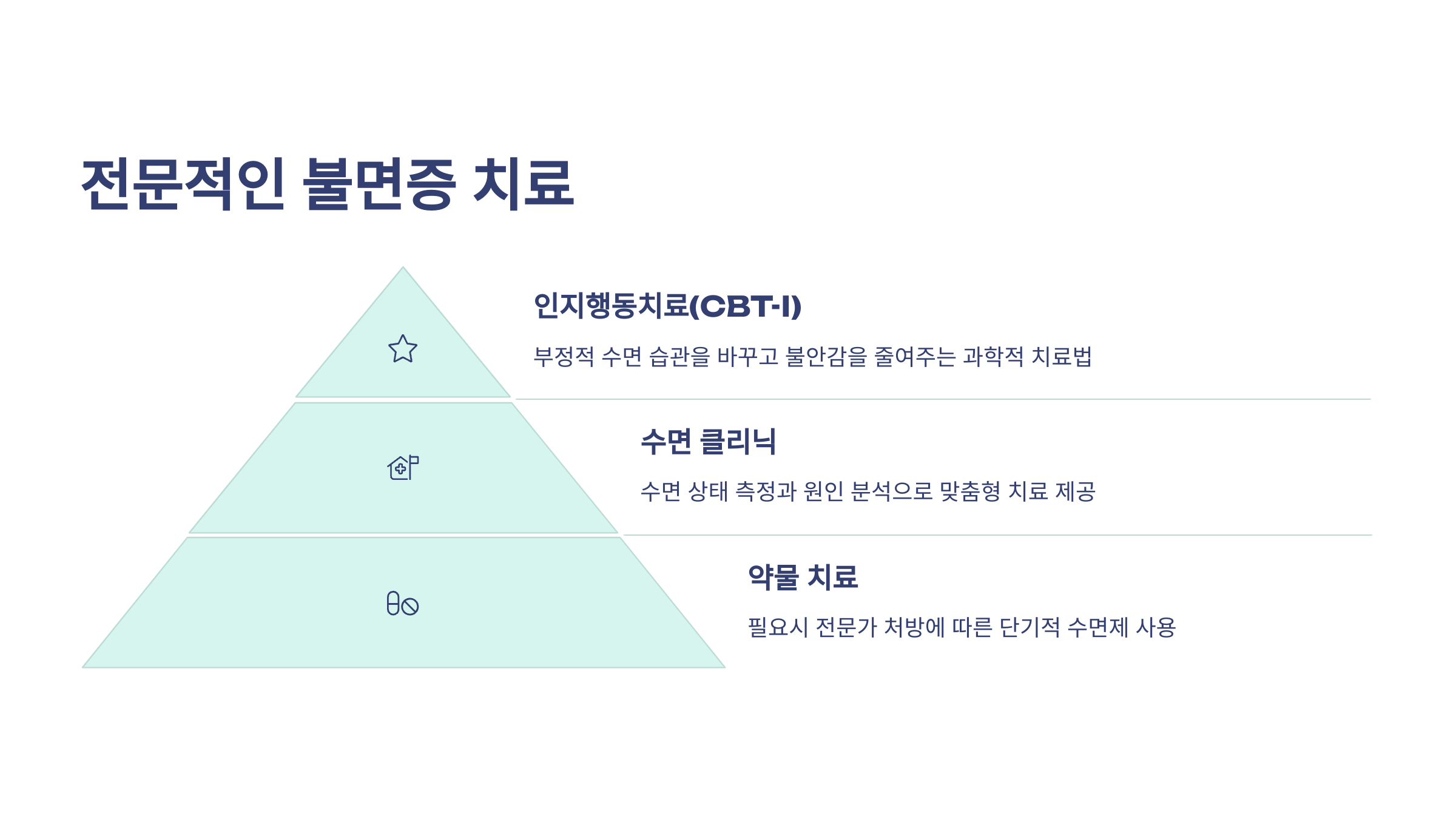 또한 인지행동치료(CBT-I)는 약물 없이 불면증을 치료하는 효과적인 방법으로 알려져 있습니다. 이는 부정적인 수면 습관을 바꾸고, 수면에 대한 불안감을 줄여주는 과학적인 치료법입니다.