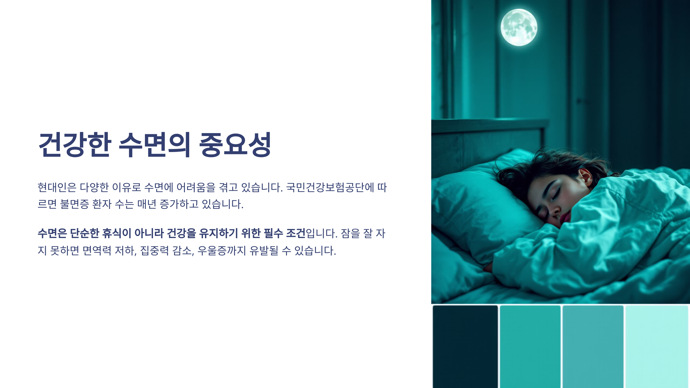 수면은 '삶의 3분의 1'을 차지하는 중요한 시간입니다. 이 시간을 건강하게 보내는 것은 남은 3분의 2를 잘 살기 위한 기초가 됩니다. 불면증은 단순한 불편이 아닌 전신 건강을 위협하는 문제라는 점을 잊지 말고, 지금부터라도 적극적으로 대처해보시기 바랍니다.