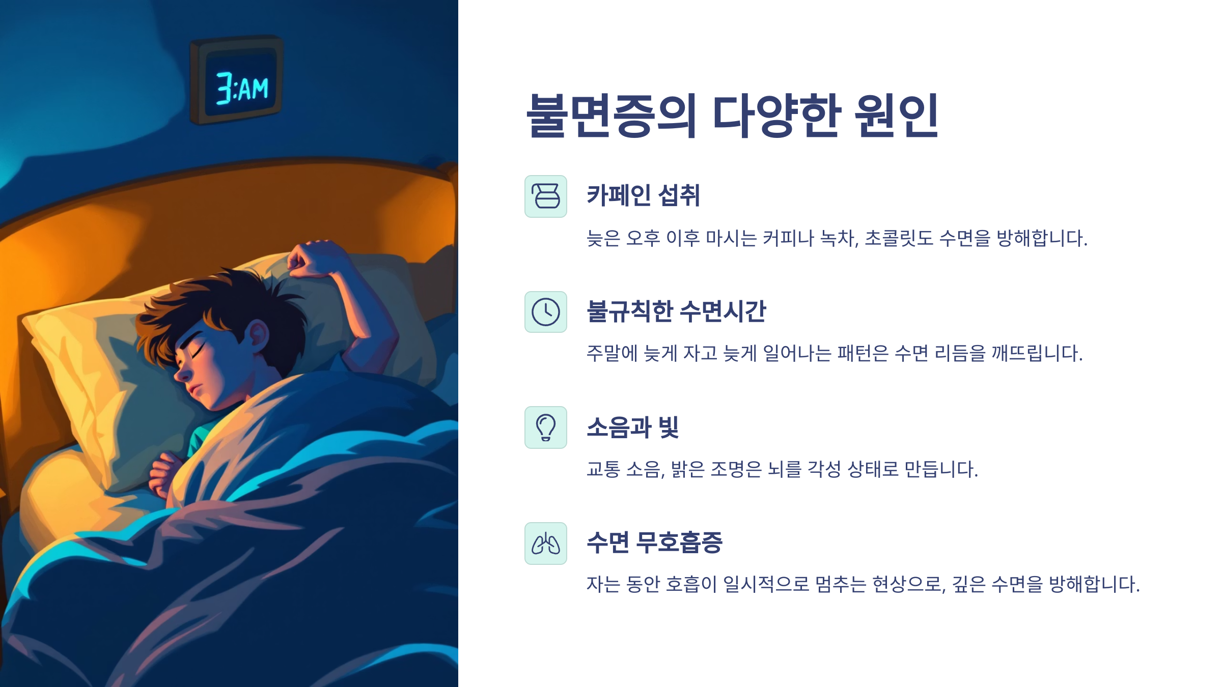 불면증은 단순한 수면 문제 그 이상입니다. 다음과 같은 다양한 원인이 숨어 있을 수 있습니다: