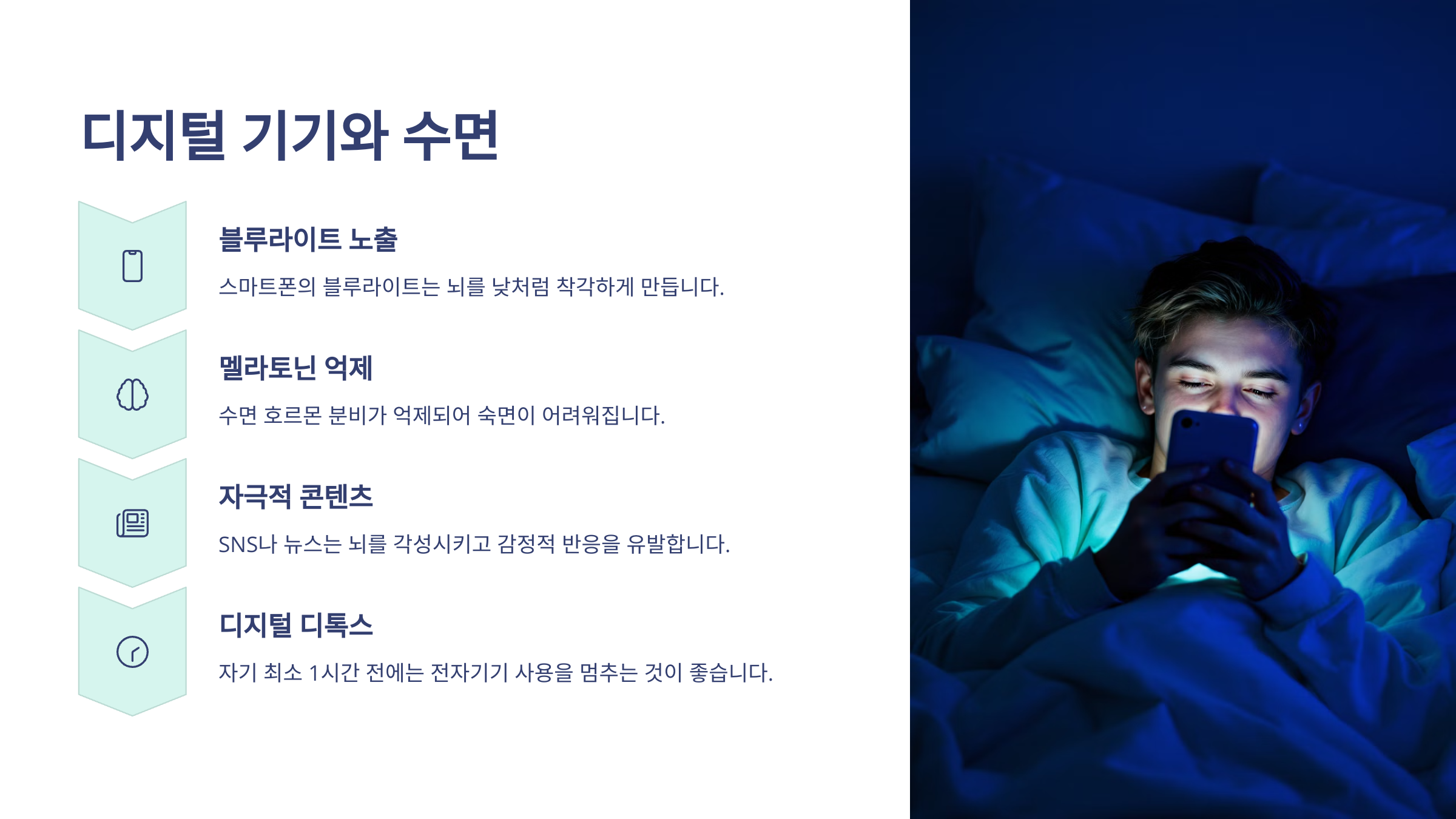 그리고 스마트폰 외에도 TV, 태블릿, 컴퓨터 사용 또한 같은 원리로 수면을 방해하므로, 취침 전 디지털 디톡스를 실천해보는 것이 도움이 됩니다.