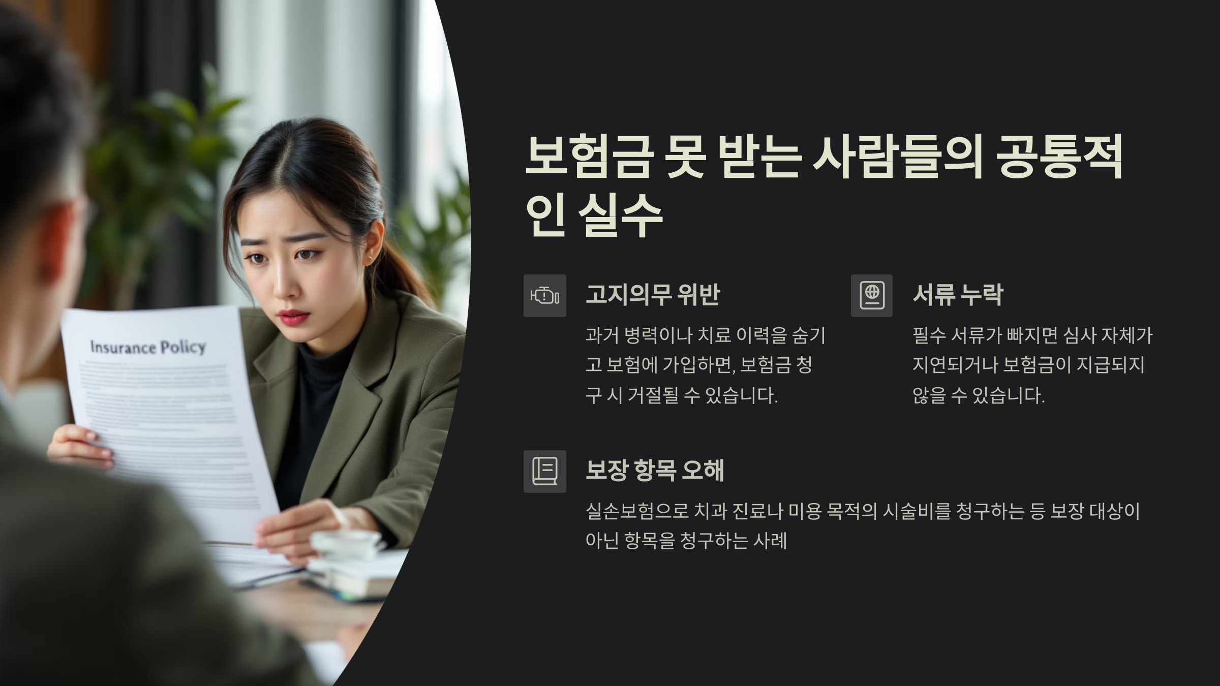 보험금을 못 받게 되는 사람들의 사례를 분석해 보면, 다음과 같은 공통된 실수가 있습니다: