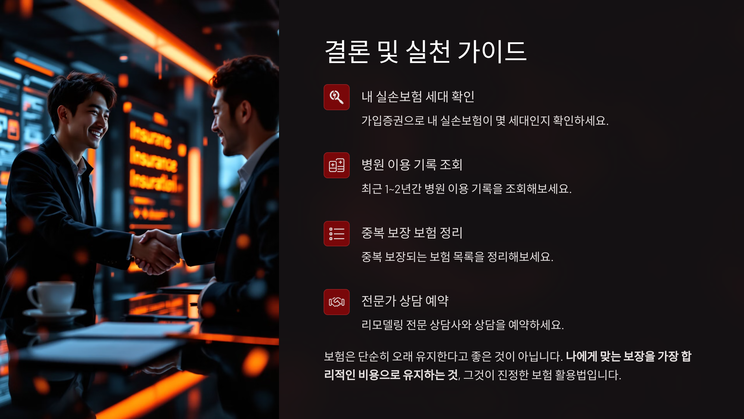 특히 1~3세대 실손보험을 보유하고 있는 분들이라면 지금 당장이라도 보장 내용을 확인하고, 전문가 상담을 받아 리모델링을 검토해보는 것이 유리합니다.