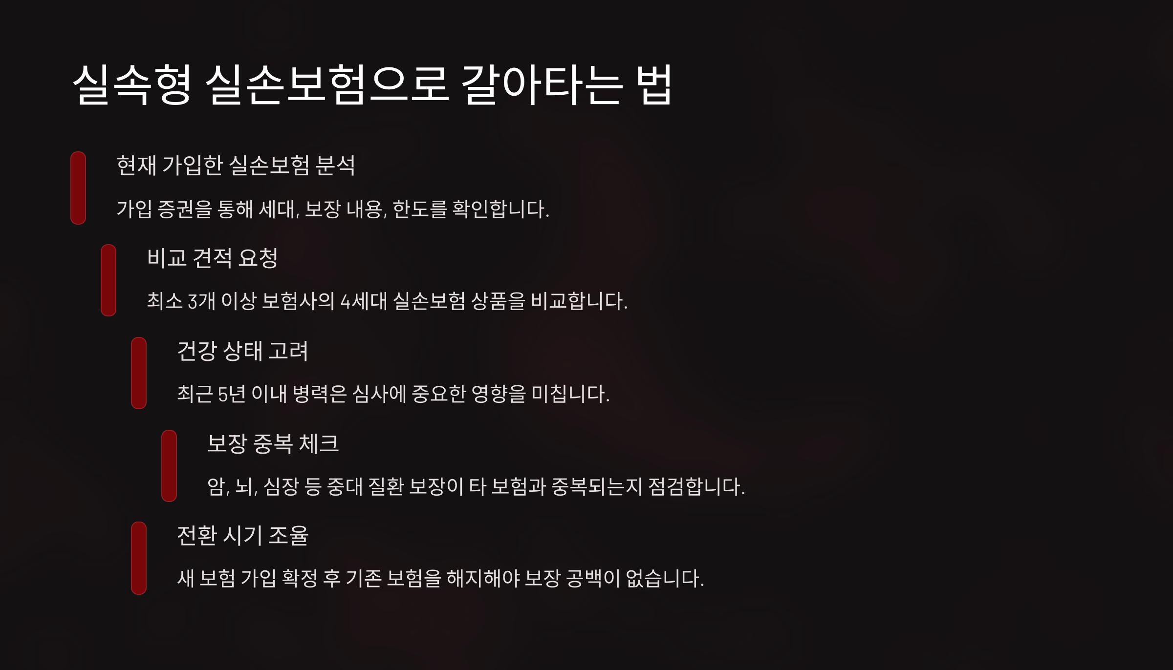 실손보험을 실속형으로 리모델링하려면 다음 절차를 체계적으로 밟는 것이 좋습니다.