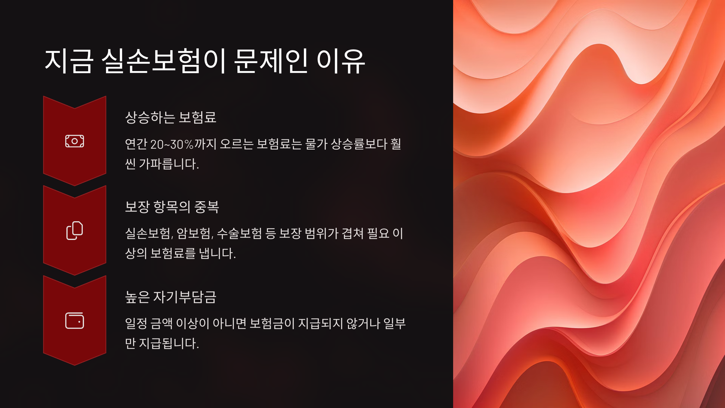 이처럼 현재의 실손보험이 실생활에서 제대로 된 혜택을 주지 못하고, 오히려 부담만 가중시키는 구조라면 지금이야말로 실속형으로 리모델링할 최적의 시점입니다. 자신의 병원 이용 패턴, 건강 상태, 재정 상황을 꼼꼼히 점검한 후, 합리적인 선택을 해야 할 때입니다.
