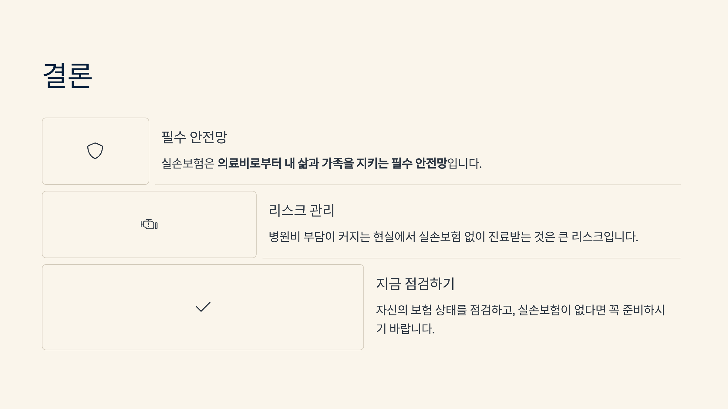 지금이라도 자신의 보험 상태를 점검하고, 실손보험이 없다면 꼭 준비하시기 바랍니다.