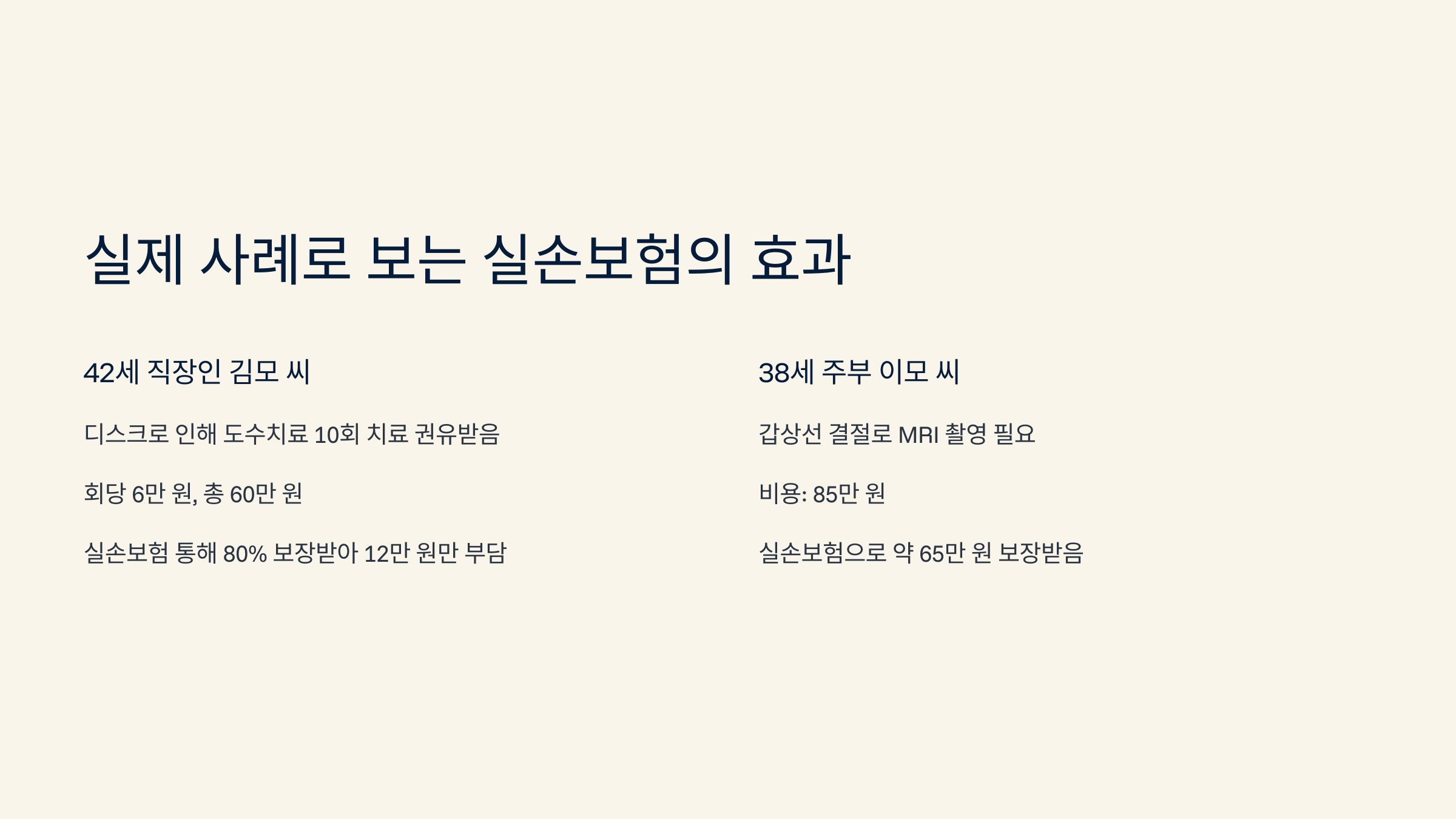 이처럼 실손보험은 실제 치료 상황에서 매우 현실적인 경제적 보호막 역할을 합니다.