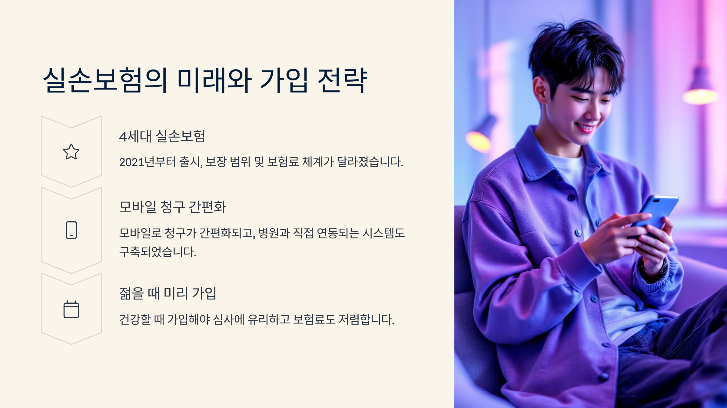 2021년부터는 4세대 실손보험이 출시되어 기존과 보장 범위 및 보험료 체계가 달라졌습니다. 특히 비급여 이용이 적은 가입자에게는 보험료를 할인해주는 구조가 도입되면서, 보험료 절약이 가능해졌습니다.