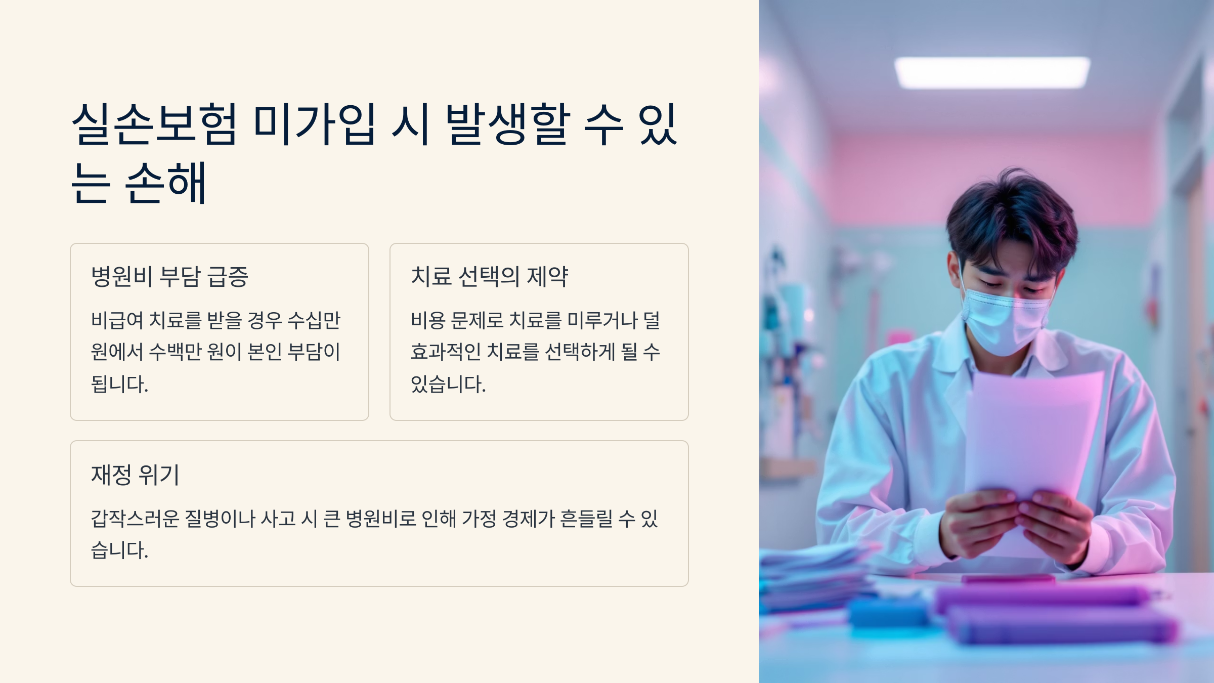 실손보험이 없을 경우 다음과 같은 문제에 직면할 수 있습니다.