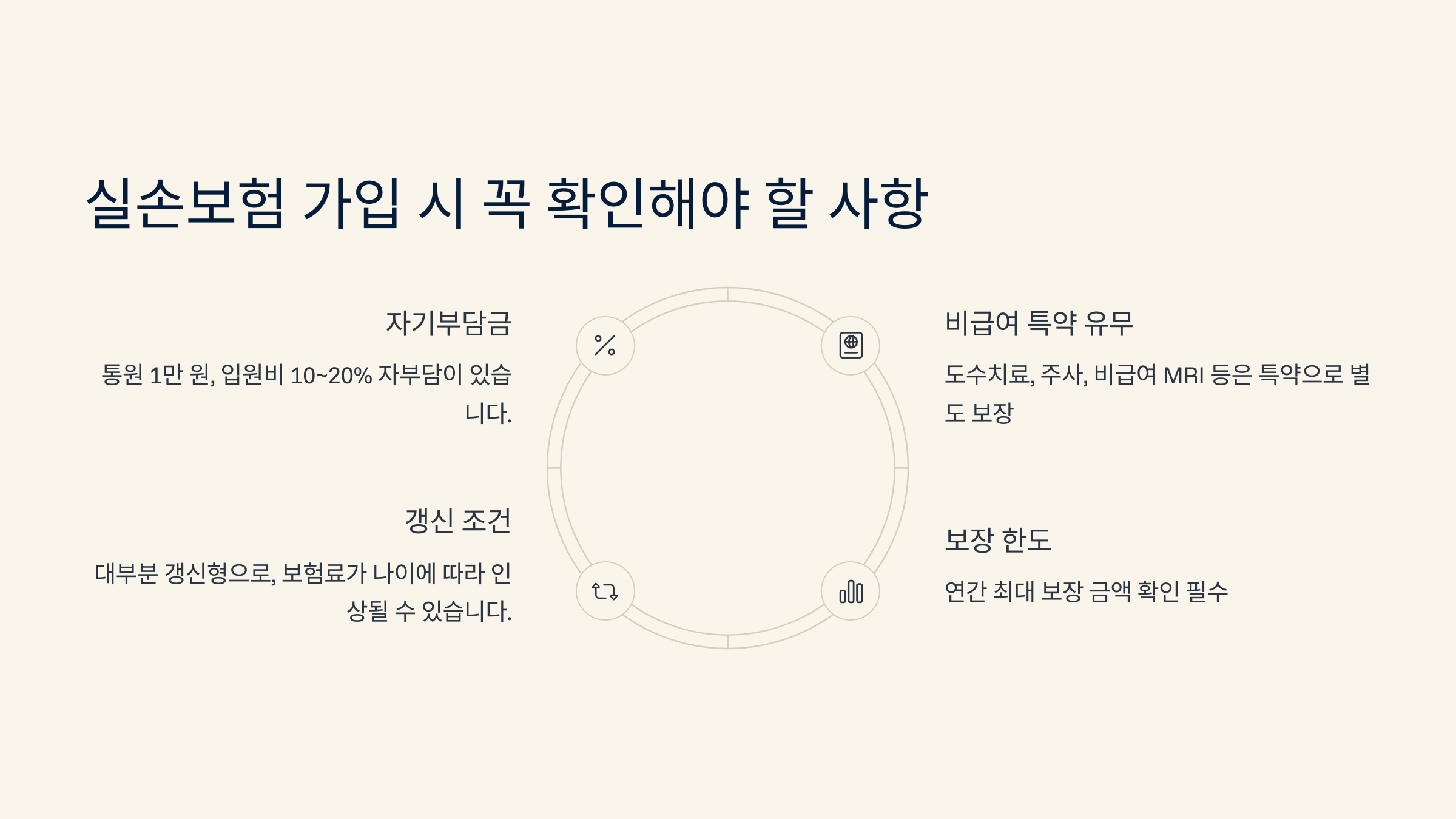 실손보험은 표준화되어 있지만, 가입 시 확인해야 할 몇 가지 중요한 포인트가 있습니다.