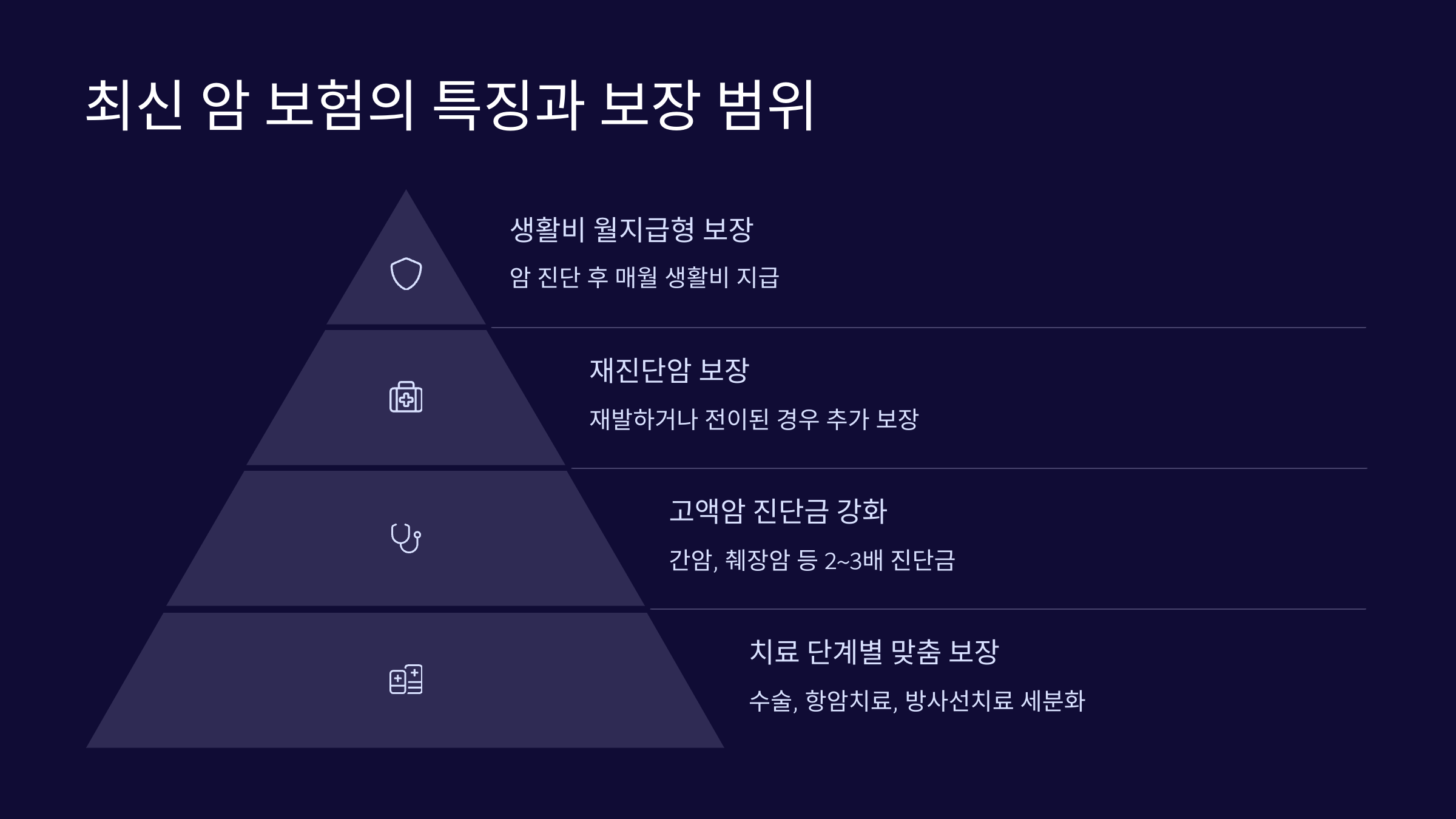최신 암 보험은 과거와 달리 더 정교하고, 더 현실적인 보장 구조를 가지고 있습니다. 주요 특징은 다음과 같습니다: