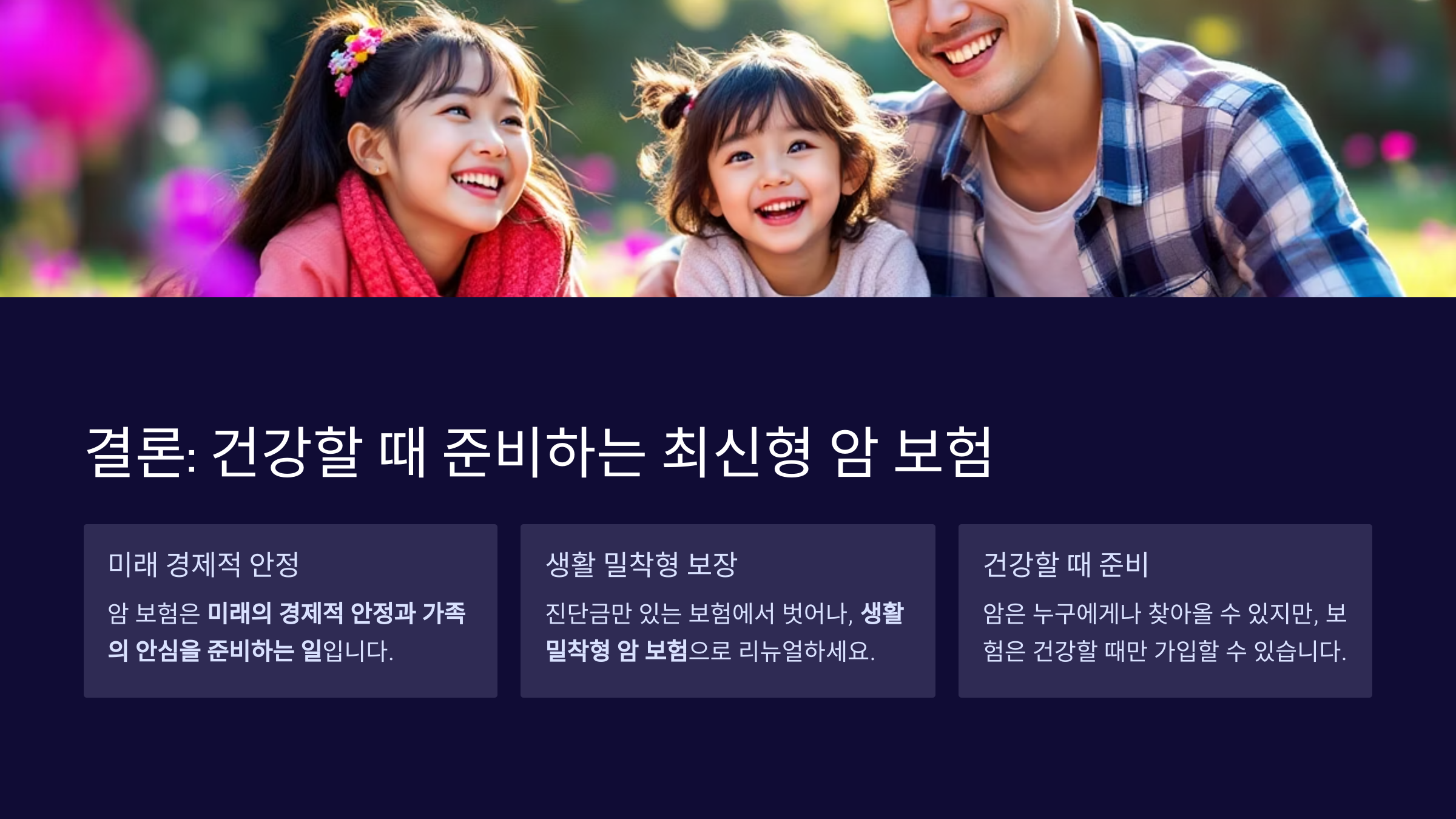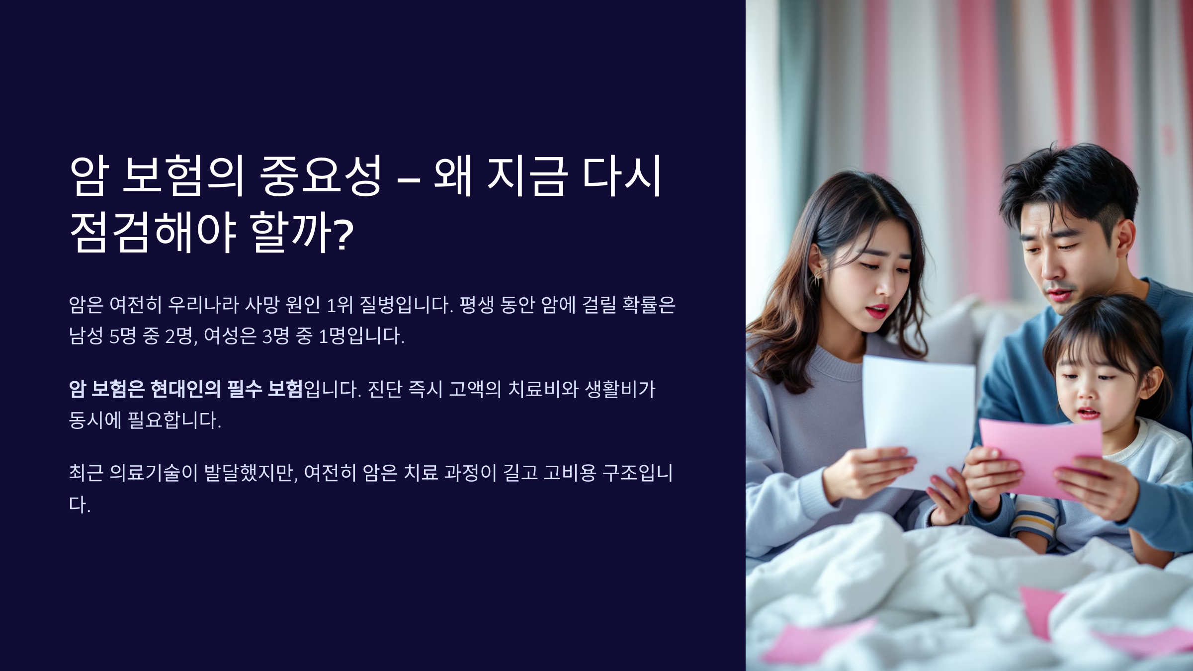 오늘 확인하고, 더 강력하게 대비하세요. 최신형 암 보험이 당신의 건강과 재정을 지켜줄 든든한 버팀목이 되어줄 것입니다.