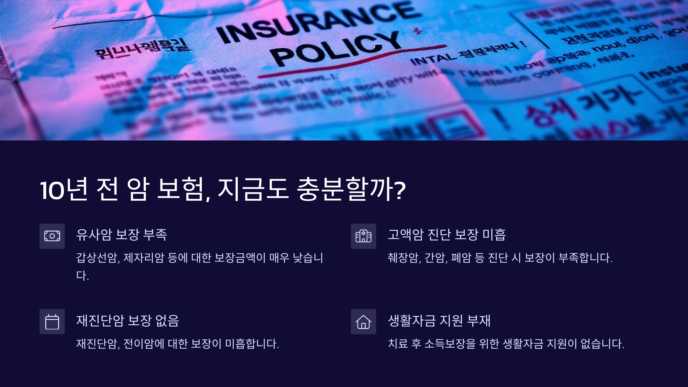 10년 전 암 보험은 지금 기준으로 보면 보장 내용이 매우 제한적일 수 있습니다.