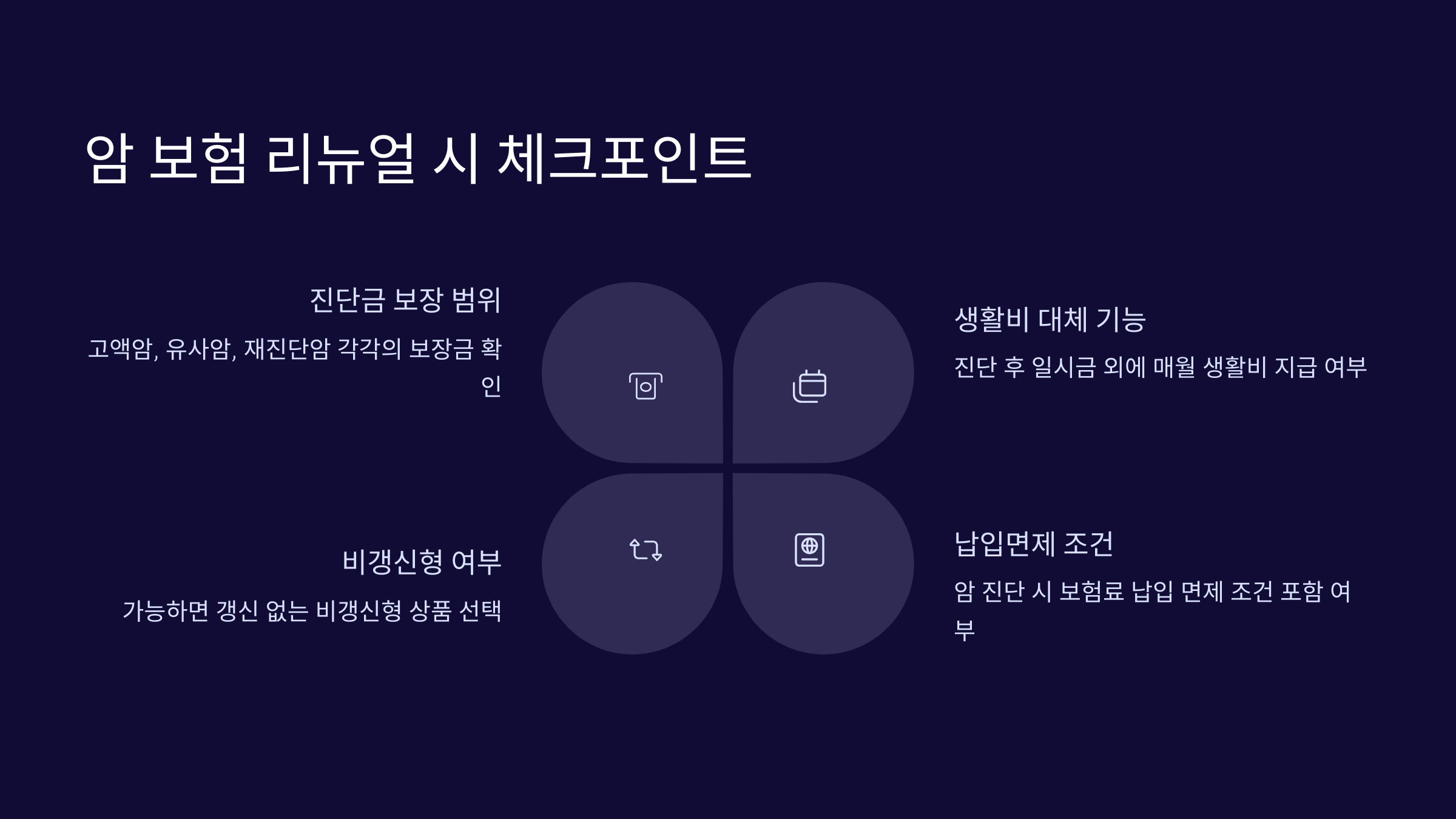 암 보험을 리모델링하거나 새로 가입할 때는 다음 항목을 반드시 체크해야 합니다:
