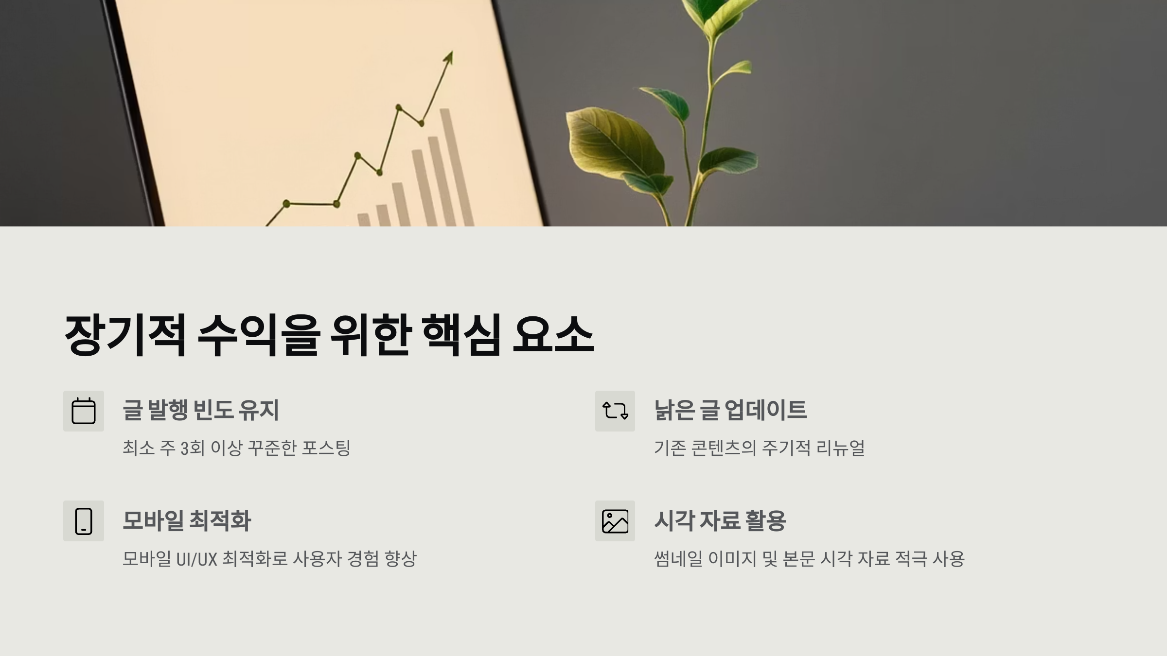 블로그는 단기전이 아니라 지속 운영을 통해 장기적으로 수익화되는 구조입니다.