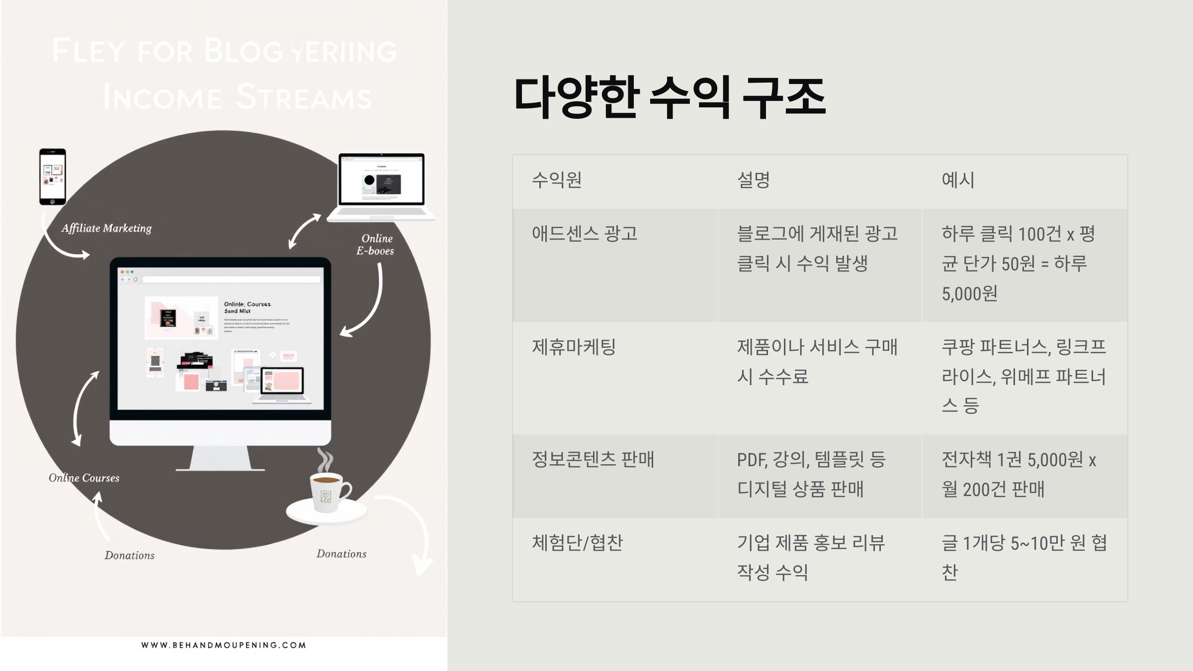 실제로 고수 블로거들은 1개의 글로 광고 수익 + 제휴 수익 + 정보 판매 수익을 동시에 창출하고 있어요.