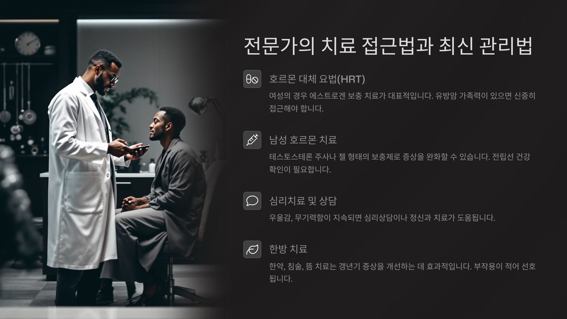 갱년기 증상이 삶의 질을 심각하게 저해할 경우, 전문가의 정확한 진단을 바탕으로 치료 계획을 수립하는 것이 중요합니다.