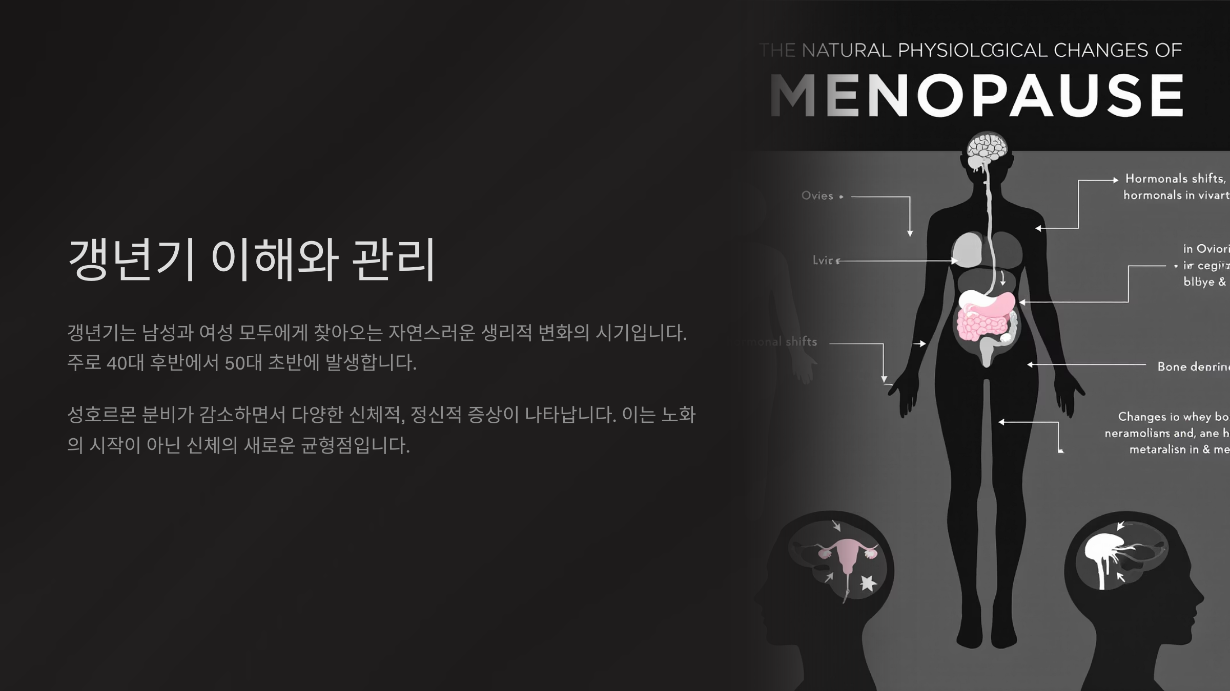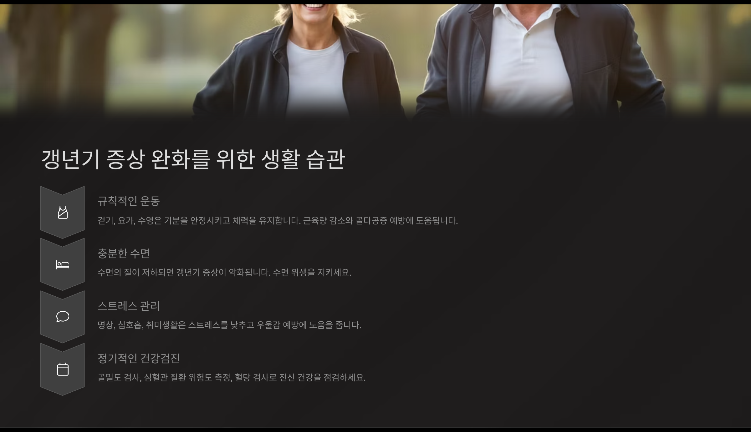 갱년기는 새로운 삶의 시작을 준비하는 시기입니다. 단지 변화에 휩쓸리는 것이 아니라, 자신을 돌보고 새롭게 삶을 설계하는 기회로 삼는다면 오히려 더 건강하고 활기찬 중년 이후의 삶을 맞이할 수 있습니다.