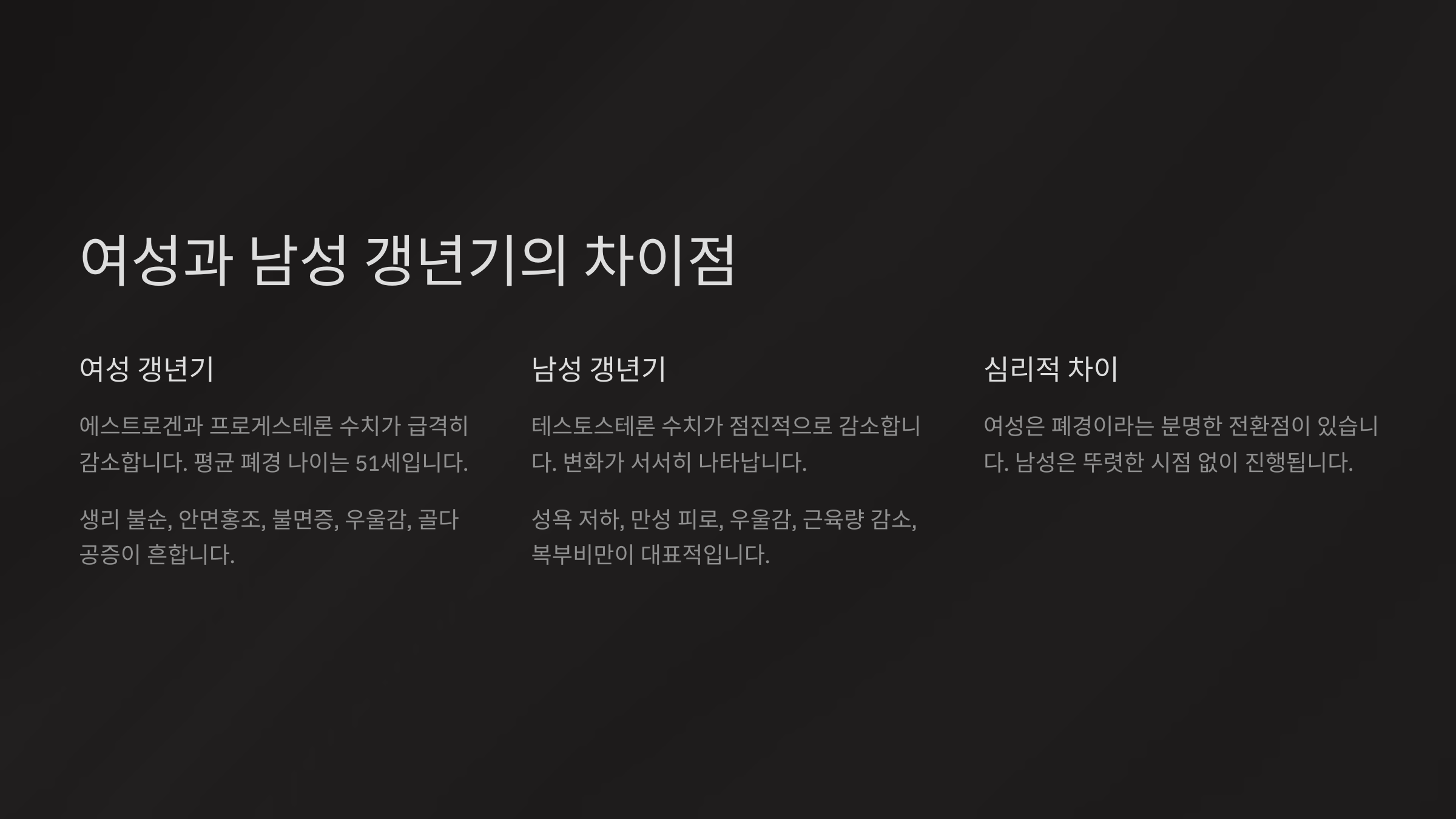 갱년기는 남성과 여성 모두에게 찾아오는 자연스러운 생리적 변화의 시기입니다. 주로 40대 후반에서 50대 초반 사이에 발생하며, 성호르몬의 분비가 급격히 감소하면서 다양한 신체적, 정신적 증상이 나타납니다. 여성의 경우 폐경이 대표적인 변화이며, 남성은 테스토스테론 수치가 서서히 감소합니다.