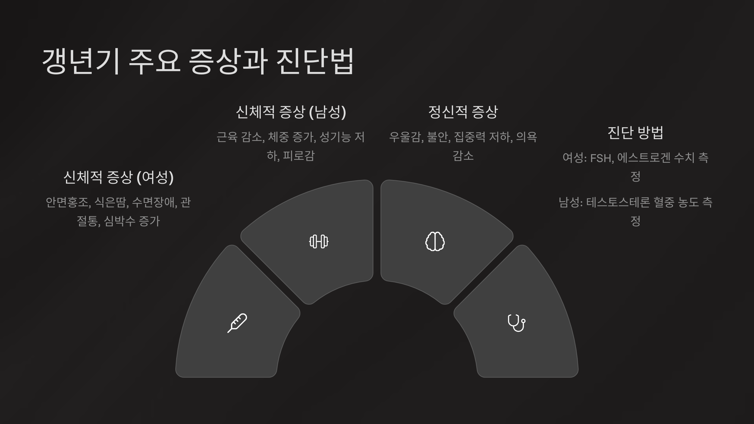 - 신체적 증상 여성: 안면홍조, 식은땀, 수면장애, 관절통, 심박수 증가 남성: 근육 감소, 체중 증가, 성기능 저하, 피로감