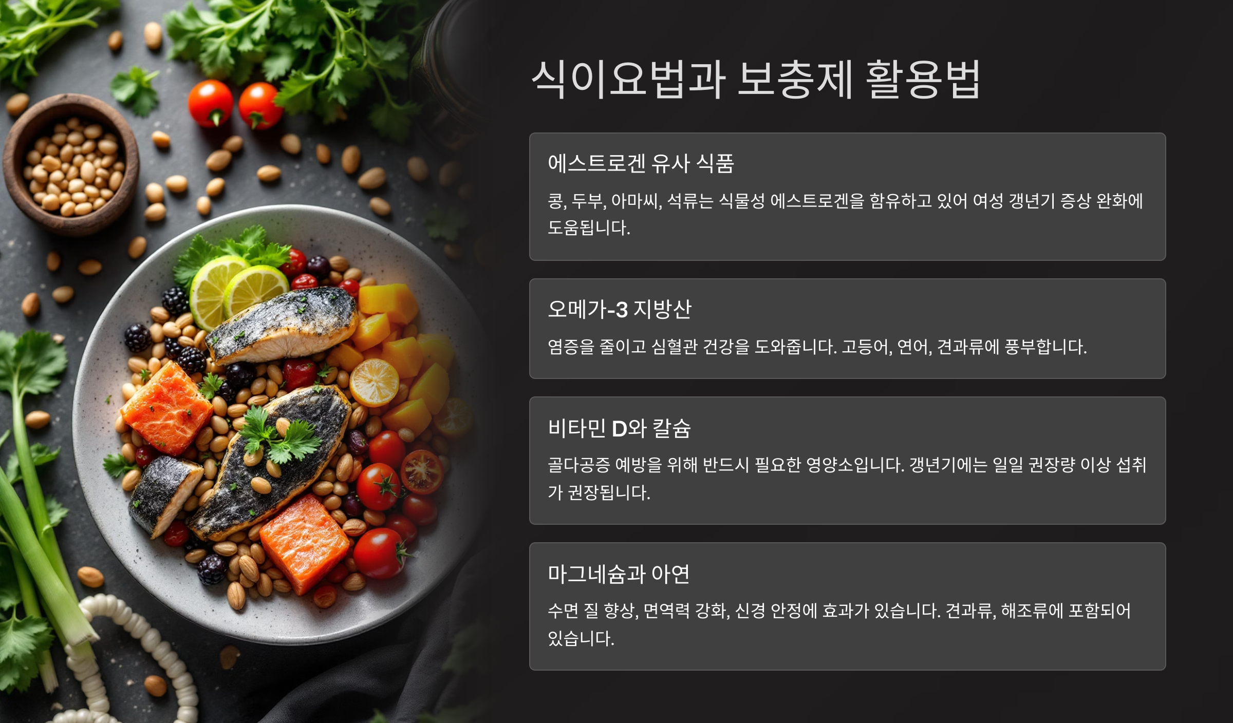 - 에스트로겐 유사 식품 섭취 콩, 두부, 아마씨, 석류 등은 식물성 에스트로겐을 함유하고 있어 여성 갱년기 증상 완화에 도움을 줄 수 있습니다.
