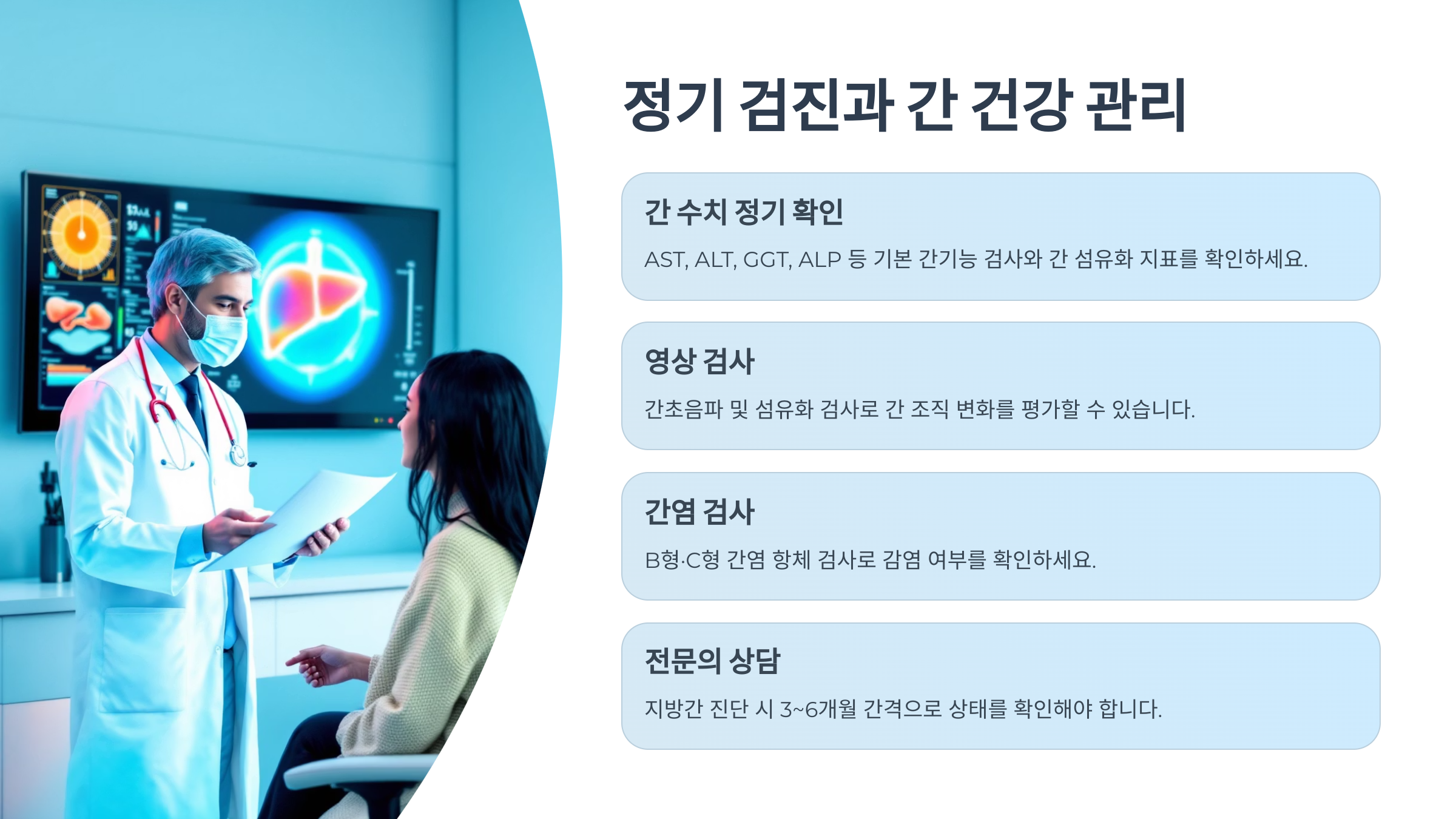 - 간초음파 및 섬유화 검사 간 조직 변화를 비침습적으로 평가할 수 있는 도구로, 연 1회 정기 검사가 권장됩니다.