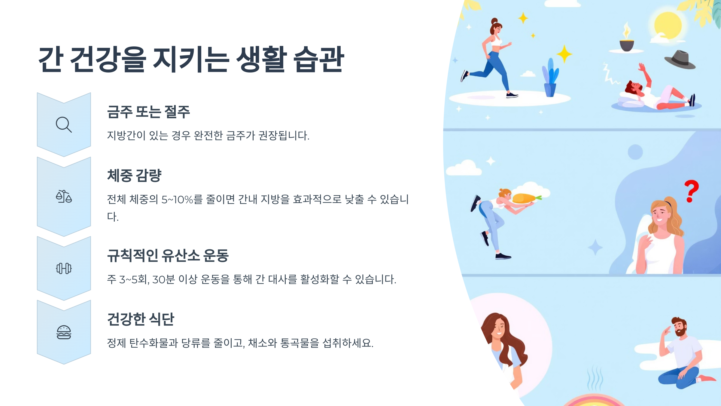 - 규칙적인 유산소 운동 걷기, 자전거, 수영 등 주 3~5회, 30분 이상 운동을 통해 간 대사를 활성화할 수 있습니다.