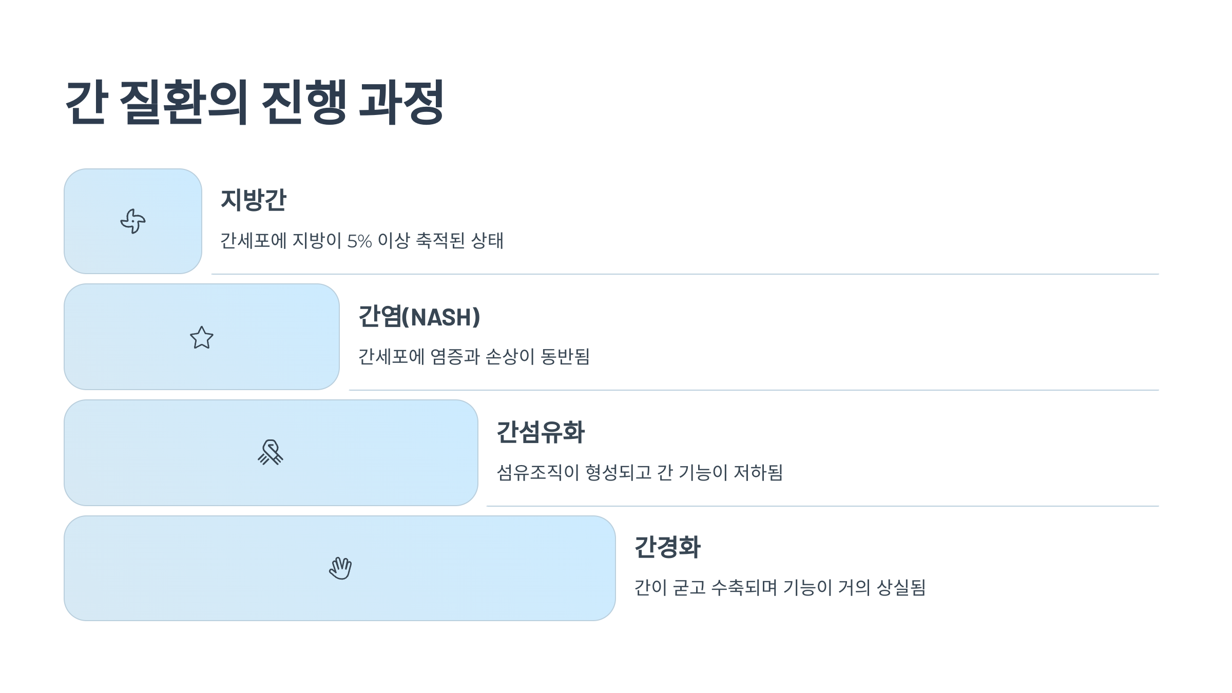 - 비알코올성 지방간염(NASH) 간세포에 염증과 손상이 동반되며, 간 기능 저하가 나타나기 시작합니다. 이 단계부터는 적극적인 치료와 관리가 필요합니다.